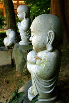 比叡山西麓、高野川の南の高台に宝幢寺(ほうどうじ/ほうとうじ)はある。山号は霊芝山(れいしざん)という。 浄土宗西山禅林寺派(永観堂)、本尊は阿弥陀如来立像。 ◆歴史年表 創建の詳細、変遷は不明。 江戸時代、寛永年間(1624-1644)/1634年、旭移(きょくい)により開創されたという。境内の夢想滝の音を、「観音経を誦する声」として草庵を結んだことに始まるという。 1697年、近くの崇道神社で発見された小野毛人墓誌の複製が当寺に移される。 現代、1988年、称名寺に伝えられていたという念仏踊りが復活した。 1991年、念仏踊りが京都市無形民俗文化財に登録される。 2011年、旧称名寺逆修板碑が境内に移される。 ◆旭移 江戸時代前期の浄土宗の僧・旭移(きょくい、 ?-?)。詳細不明。寛永年間(1624-1644)/1634年、宝幢寺を開創する。 ◆本尊 本尊の「阿弥陀如来立像」は、信濃・善光寺本尊を写したものという。「相好貴奇」な仏像として知られた。多くの仏師が造仏の見本として訪れたという。 善光寺の本尊は善光寺式阿弥陀三尊像(一光三尊阿弥陀如来像)といわれている。中央に阿弥陀如来、右に観音菩薩、左に勢至菩薩が立ち、三尊が一つの光背の中にある。絶対秘仏とされ、厨子は堅く閉じられている。7年に一度の御開帳もお前立ちのみが公開される。お前立ちは鎌倉時代の作で、一応、本尊の写しとされているが確認はされていない。 『善光寺縁起』によると、善光寺如来は、釈迦が生前していたインドで出現したという。百済を経て飛鳥時代、552年、欽明天皇の頃、日本への仏教伝来とともに伝わったという。「生身の如来様」といわれ、人肌の温もりがあり、語らい、白毫からは智恵の光明を発するという。印相は、施無畏印(右手は手のひらを開く)、左手は刀印(手を下げ、人差指と中指を伸ばしほかは曲げる)という。これは飛鳥・白鳳時代、法隆寺金堂の釈迦三尊像などに見られる特徴という。左右の菩薩は梵篋印(胸の前で左の掌に右の掌を重ね、掌の中に真珠の薬箱が隠されているという)を結ぶ。三尊像は蓮花弁が散った蕊の重なる蓮台に立つ。 京都での善光寺式阿弥陀三尊像は得浄明院に安置されている。 廃寺となった称名寺(称名寺)本尊だった「阿弥陀如来」も宝幢寺に安置されているという。 ◆建築 山門、鐘楼、本堂、書院、庫裡などが建つ。観音堂跡がある。 ◆文化財 室町時代の紙本彩色「円光大師像」一幅、室町時代の絹本著色「地蔵菩薩像」一幅。 「金銅小野毛人(えみし)墓誌」(国宝)の木製摸像品がある。近くの崇道神社本殿奥の山中より、江戸時代、1613年、石棺中から銅板墓誌(京都国立博物館保管)が発見された。遣隋使・小野妹子の子・毛人(?-677)の墓とされた。ただ、墓誌は奈良時代(8世紀前半)のものという。この地は、山城国愛宕郡小野郷にあたり、小野氏の本拠地のひとつになっていた。1697年の再埋め戻しの際に複製が当寺に移された。 宝幢寺境内に「称名寺逆修板碑」が8基立つ。逆修とは生前に逆(あらかじ)め自らの死後の冥福を祈って仏事を営むことをいう。江戸時代、1646年に稲荷町にあった称名寺に建立された。寺はその後、廃寺になる。1870年、板碑は上高野墓地入り口に移転した。2011年、祠を建立し宝憧寺境内に移されている。 ◆夢想の滝 境内東の夢想滝には、梅谷川より水が引かれている。かつて、滝上に観音像が安置されていたという。開山の旭移が滝音を「観音経を誦する声」と聞いて草庵を結んだという。 ◆念仏踊り 8月19日夜、宝憧寺境内で念仏踊りが舞われている。新仏になった人を偲ぶもので、踊り手は施餓鬼台の位牌を囲む。右手に団扇を持ち、浴衣に三巾前垂れ姿の女性達が、「南無阿弥陀仏」と念仏を唱えながら鉦、太鼓の囃子で静かに踊る。 平安時代、949年、称名寺(廃寺)の境内で始まったものという。近代、大正期(1912-1926)末に途絶える。その後、1988年に復活した。1991年、京都市無形民俗文化財に登録されている。 ◆花暦 紅葉。 ◆年間行事 念仏踊り(8月19日)。 *非公開。境内参詣自由。 *年間行事などは、中止・日時・内容変更の場合があります。 *年号は原則として西暦を、近代以前の月日は旧暦を使用しています。 *参考文献・資料 『京都府の歴史散歩 中』、『京都の寺社505を歩く 上』、『日本の古代遺跡28 京都Ⅱ』、『昭和京都名所図会 3 洛北』 、ウェブサイト「コトバンク」 |