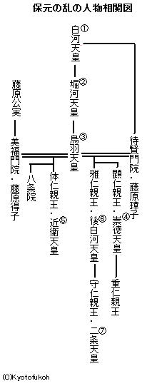 ![]() 「此附近 白河北殿址」の石標 ![]() *番号は皇位継承の順番 保元の乱の対立関係 © Kyotofuko