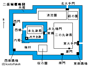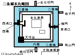 二条城(にじょう-じょう)は、回字形平城(かいじがた-ひらじろ)であり、正式には「元離宮二条城」、「旧二条元離宮(二条城)」と呼ばれる。かつて、白い多聞塀(土塀)が城の四周を取り囲んでいたことから「霞城(かすみじょう)」とも呼ばれた。 徳川家康の二条城築造の意図は、天皇の監視と御所の権勢にあったといわれている。神泉苑を取り込んだのも、王権剥奪の意図があったという。 市街地であるにもかかわらず、南の神泉苑の豊かな湧水により、現在も城の外堀、内堀の水は満されている。敷地面積27万5000㎡、建物面積7300㎡の広大な面積を有している。城域は東西500m、南北400mある。 二の丸御殿など6棟の建物が国宝、東大手門など22棟が重文に指定されている。二の丸御殿の障壁画954点も重文指定され、二の丸庭園は国の特別名勝指定になる。 1994年、城内全域がユネスコの世界文化遺産・史跡に登録された。「ミシュラン・グリーンガイド・ジャポン 2つ星観光地」(改訂第4版)に選ばれている。アメリカ合衆国の日本庭園専門誌"Sukiya Living Magazine, The Journal of Japanese Gardening"の「しおさいプロジェクト」「日本庭園ランキング(数寄屋生活空間)」に、2006年-2007年に清流園和楽庵は連続して第6位に選ばれている。2003年に二の丸庭園は第6位に選ばれた。二条城・二条城二之丸は、「美しき日本-いちどは訪れたい日本の観光遺産」(日本交通公社、1999年)の一つに認定された。 ◆歴史年表 平安時代、この地は、神泉苑境内北の一部に含まれ、平安京大内裏域東南にあり、一部に冷泉院跡地になっている。 安土・桃山時代、1587年、城域北の内野(うちの)に、豊臣秀吉により聚楽第が造営されている。 1601年、旧5月、神泉苑北辺一帯の町家5000軒に立ち退きが命じられた。徳川家康は二条城築城に着手する。 1602年、旧5月、家康は西国大名に平城の二条城築城(手伝普請)を命じた。将軍上洛時の居城として、二の丸御殿が築造される。予定地の家屋数千軒が立ち退きになり、南の神泉苑の池を堀として転用したという。京都守護、朝廷監視の政治的な役割も担ったといわれている。総奉行は京都所司代・板倉勝重による。大工は中井正清らによる。当初は、「内府(家康)屋形」「二条亭」「二条新御所」「二条(京都)新屋敷」とも呼ばれた。現在の城域の東3分2の方形部分にあたる。城の外周には、京都所司代、京都町奉行所、京都代官所など幕府の重要機関、大名の京屋敷などが置かれていた。 江戸時代、1603年、本丸御殿(二の丸御殿)、池泉庭が完成する。旧3月、家康は入城する。旧4月、家康は伏見城において将軍宣下を受けた。方形、一重堀に囲まれた二条城に勅使を迎え、3日間にわたり征夷大将軍拝賀の礼と、後に就任の祝宴を行う。 1605年、2代・秀忠が将軍宣下を受け、二条城から拝賀の礼に赴く。3代・家光まで拝賀の礼が城内で行われた。 1611年、旧3月、家康は城内で豊臣秀頼と会見した。この時、加藤清正が淀殿を説得し実現に貢献した。家康は、この時、豊臣家を滅ぼすことを決意したともいう。城内で謁見したポルトガル人に貿易を許可している。 1614年、旧10月、大坂方の二条城焼き討ち計画が、板倉勝重により阻止された。大坂冬の陣の際に、城は徳川幕府軍の本陣になり軍議が開かれた。旧11月15日、当城より家康、伏見より秀忠の軍勢は大坂に出陣した。大坂冬の陣が開始される。幕府が求めた秀頼追討の綸旨を朝廷は拒否する。旧12月25日、大坂冬の陣が和議になり、家康は二条城に凱旋した。 1615年、旧4月27日、大坂夏の陣が始まる。旧5月、大坂夏の陣の際に、家康は当城より、秀忠は伏見より出陣した。家康は二条城に凱旋する。大坂町奉行・水原吉一の処刑後、首級が二条城西門に晒された。旧5月8日、大坂城は落城した。5-7月、天台宗、真言宗、浄土宗、高野衆などの議論相次ぐ。旧7月17日、2代将軍・秀忠は城に入り「禁中並公家諸法度」を発布した。国政を幕府に委ねることを示した。大御所・家康、前関白・二条昭実も署名する。旧8月、家康は二条城を発し駿府に帰る。(1616年旧4月、家康は駿河城で亡くなる。) 1619年、2代将軍・秀忠は、娘・和子を第108代・後水尾天皇に入内させるために城の改修工事を行う。 1620年、旧5月、和子は入第の宿所とした二条城に入る。旧6月、和子は御所に入る。 1623年、徳川家光上洛に際し、三笠閣が建造される。秀忠、家光が入洛し、二条城に入城した。旧7月、二条城の西長屋が崩壊した。旧8月、家光は将軍宣下を受け、二条城から参内し拝賀の礼に赴く。旧閏8月、暹羅(シャム)国使節が二条城大広間で秀忠に拝謁する。 1624年、旧1月より、後水尾天皇行幸に際し、3代将軍・家光は大規模な改修・増築(寛永度造営)を行い、西に拡大し現在の姿が造られた。作事は小堀遠州による。本丸の増築、二の丸、五層の天守などが造営される。伏見城から西南隅に天守を移し、二の丸にあった天守は淀城に移される。庭園も整備された。なお、伏見城の破却が終了した。この年以後、
