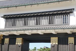 ![]() ![]() 御殿車寄、遠侍 ![]() 御殿車寄、欄間の彫刻 ![]() 車寄 ![]() 御殿車寄、左奥は遠侍 ![]() 遠侍(国宝) ![]() 遠侍 ![]() 式台(国宝) ![]() 大広間(国宝) ![]() ![]() 大広間の廊下に見られる鴬張りの金具、床下に取り付けられている。 ![]() 蘇鉄の間 ![]() 黒書院(国宝) ![]() 白書院(国宝) ![]() 白書院