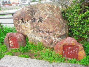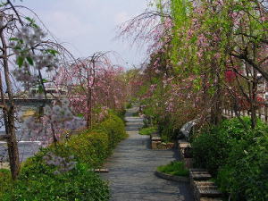 三条大橋の東詰南に「花の回廊(はな-の-かいろう)」の碑がある。 平安京遷都1200年(1997)を契機として行なわれた「京の川づくり」では、鴨川三条と七条間の散策路が整備された。 1987年、鴨川三条と七条間を走っていた京阪電車と琵琶湖疏水が地下化された。この改修工事により、戦前からの念願であった鴨川河道の拡幅改修も実現している。その後、京都府と京都市は、三条から七条間の鴨川東岸で「花の回廊」整備事業(1992-1999)を完成させた。 鴨川に沿う川端通の西には、公募された和歌や俳句の石碑が建てられている。 花の回廊には、シダレザクラを初め、モミジ、ヤナギ、ユキヤナギ、コムラサキシキブ、ツツジ、ドウダンツツジ、ヤマブキなどの樹木が植栽され、それまで植えられていた樹木も生かされた、四季を通じて草花が楽しめる新しい散歩道が生まれた。 「花の回廊」では、毎年4月初旬(2007年は4月7日、8日)に、「鴨川さくらまつり」が催されている。鴨川河川敷の東岸(四条大橋-三条大橋間)にはサクラ50本が植えられており、期間にはサクラ並木がライトアップされる。対岸の西岸には「花灯路」が灯される。 *参考文献・資料 ![]() ![]() ![]() ![]() ![]() ![]() ![]() |