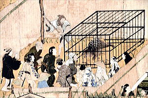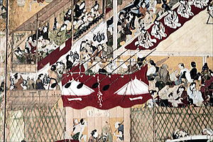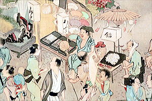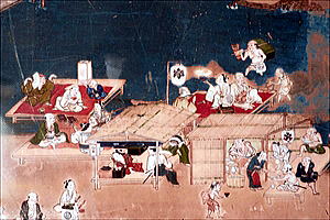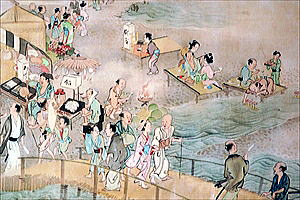 【参照】江戸時代初期の「四条河原遊楽図屏風」、御池大橋の説明板より![]() 【参照】上掲「四条河原遊楽図屏風」の芝居小屋 ![]() 【参照】上掲「四条河原遊楽図屏風」の見世物小屋 ![]() 【参照】江戸時代前期の「鴨川遊楽図」、四条河原の中洲様子、御池大橋の説明板より ![]() 【参照】上掲「鴨川遊楽図」の夕涼み ![]() 【参照】上掲「鴨川遊楽図」の射的 ![]() 【参照】江戸時代前期、円山応挙の「華洛四季遊戯図巻」、中洲での夕涼みの様子、御池大橋の説明板より ![]() 【参照】上掲「華洛四季遊戯図巻」の飴売り、扇子売り ![]() 【参照】江戸時代中期の『都名所図会』に描かれている四条河原夕涼(ROIS-DS人文学オープンデータ共同利用センター) |