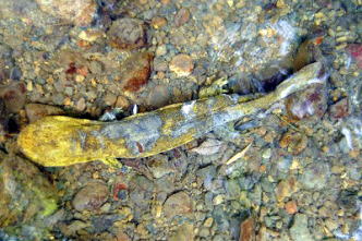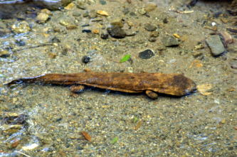 ![]() 鴨川源流、オオサンショウウオ(体長70cmほど)、傷を負って死んでいた。(2007年) ![]() 鴨川中流域でのオオサンショウウオ(体長60㎝ほど)(2010年8月) |