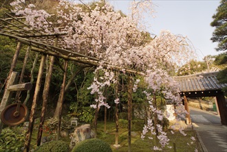 泉涌寺山内に、塔頭・新善光寺(しんぜんこう-じ)がある。 浄土宗、本尊は阿弥陀如来立像。 泉山(せんざん)七福神の番外、愛染明王になる。 ◆歴史年表 鎌倉時代、1243年、8月、僧・値願念西が勧進し、第88代・後嵯峨天皇の御願寺として当初は一条大宮の地に創建された。勅命により、信州信濃・善光寺の本尊を模し、本尊・阿弥陀如来立像を鋳造した。善光寺に因み寺号は新善光寺と称した。(寺伝) 南北朝時代-室町時代、庶民の崇敬を受け、寺領も整い、寺運隆盛になる。 室町時代、応仁年間(1467-1469)、応仁・文明の乱(1467-1477)により焼失した。 1473年、第103代・後土御門天皇の勅命により泉涌寺山内に移される。 江戸時代、寛文年間(1661-1673)、孤雲正瑞により、現在地に移され再興された。 1673年、現在の方丈が建てられる。 ◆値願念西 鎌倉中期時代の浄土宗の僧・値願念西(ねんさい、?-? )。詳細不明。男性。1243年、新善光寺の歓進を行い、第88代・後嵯峨天皇の御願寺として一条大宮の地に創建した。 ◆良純入道親王 江戸時代前期の皇族・良純入道親王(りょうじゅん-にゅうどうしんのう、1604-1669)。男性。幼称は八宮。父・第57代・後陽成天皇、母・大典侍具子(ともこ、庭田重具の娘)の第8皇子。1614年、親王になり直輔(ただすけ)と名のる。1615年、徳川家康の猶子になる。1619年、出家し浄土宗・知恩院の初代門跡になる。1643年、放蕩などにより、幕府は甲斐天目山に流した。1659年、赦され泉涌寺に入る。和歌、名筆家として知られた。67歳。 新善光寺(東山区)に宝篋印塔が立つ。 ◆孤雲正瑞 江戸時代前期の僧・孤雲正瑞(?-?)。詳細不明。男性。寛文年間(1661-1673)、新善光寺を再興した。 ◆仏像 ◈本尊の「阿弥陀如来立像」が安置されている。信州信濃(長野県)の善光寺様式になる。 鎌倉時代中期、1243年に、第88代・後嵯峨天皇の勅命により新善光寺が創建された。大工(棟梁)・藤井為行、小工(技術者)・沙弥教弘らは、信州の善光寺本尊を模し、金銅の阿弥陀如来立像を鋳造した。この同仏同体を本尊にしたという。善光寺の阿弥陀像は霊験あらたかとされていた。信州への参詣は困難なためその代わりにされた。 像は左手は刀印(左手を下げ、人差し指・中指を伸ばし、ほかは曲げる)、法衣は通肩(両肩を覆う)になっている。 ◈両脇侍は梵筺印(胸前で両手掌を水平にして重ねる)を結び頭に宝冠を被る。 ◆文化財 江戸時代の狩野派による襖絵58面がある。 ◆七福神巡り 泉涌寺山内の七福神めぐり(成人の日)は、泉涌寺(泉山)七福神巡りとして塔頭9カ寺を巡る。現代、1951年以来続けられている。これらを福笹を持ちお参りしていく。 第1番は福禄寿・即成院、第2番は弁財天・戒光寺、番外の愛染明王・新善光寺、第3番は恵比寿神・今熊野観音寺、第4番は布袋尊・来迎院、第5番は大黒天・雲龍院、番外の楊貴妃観音・泉涌寺本坊、第6番は毘沙門天・悲田院、第7番は寿老人・法音院になる。 ◆墓 知恩院初代門跡・良純親王の宝篋印塔が立つ。 知恩院初代門跡・良純親王(1604-1669)は、島原林屋の名妓・八千代太夫(?-1679)と懇意になり、京都所司代・板倉重宗は、八千代を落籍させ当初は知恩院前に住まわせた。 親王の兄、第108代・後水尾天皇は二人の仲を知り、怒り、勅命により二人を山梨天目山に永久追放した。だが、17年後、二人は上皇に許されて帰洛、当院において一時暮らす。その後、八千代は世を憚り近くの民家に身を隠した。 1664年、親王は還俗し、晴れて両人は夫婦になる。その後、瑞光院(上京区)に移り、院内の以心庵に暮らしたという。以後、親王は以心庵と号し、八宮重雅と名乗った。その5年後に親王は亡くなる。 瑞光院の過去帳には夫婦の名があったという。新善光寺には良純親王の宝篋印塔が墓地の裏に立つ。八千代の墓は、かつて瑞光院近くに姫塚としてあったという。 ◆桜 境内に枝垂桜が咲く。 ◆年間行事 泉山(せんざん)七福神巡り(1月成人の日)。 *年間行事は中止・日時・内容変更の場合があります。 *年号は原則として西暦を、近代以前の月日は旧暦を使用しています。 *参考文献・資料 『京都府の歴史散歩 中』、『京都・山城寺院神社大事典』、『京都隠れた史跡100選』、『京都傑作美仏大全』、『京の福神めぐり』、ウェブサイト「コトバンク」 ![]() ![]() ![]() ![]() ![]() |