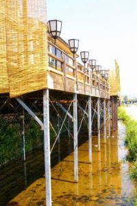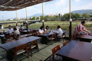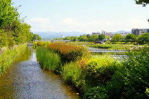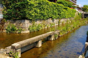 みそそぎ川は、鴨川から取水されており、鴨川の分流になる。 ◆歴史年表 近代、1894年、琵琶湖疏水の完成後、鴨川の夏の風物詩だった床は、東岸は中止になった。 1911年、四条大橋に市電が開通した後、中州の床も中止になる。 1935年、「昭和10年大洪水」により、大きな被害が出た。 1936年-1947年、大規模な鴨川の河川改修工事、「千年の治水」が行なわれた。この河川改修工事は、鴨川だけではなく、御室川、天神川、高野川などでも施工された。ただ、第二次世界大戦中のことであり、資材、資金不足などにより工事は難航した。1943年に国の援助が得られ、完成を見たのは戦後のことだった。鴨川の補修工事により、人工水路みそそぎ川も生まれた。 その後、みそそぎ川の上に納涼床を設けるようになった。 ◆流路 みそそぎ川は、賀茂大橋下流西岸で鴨川から取水され、鴨川河川敷(高水敷)を暗渠になって南へ流れる。川名の由来は、「賀茂神社の西の賀茂川の別名」(田中緑紅『京の三名橋(中)四条大橋』)という。みそそぎ川の初出は、近代、1936年4月の京都府臨時府会とみられる。 丸太町橋下流で、川は地上に姿を見せ、鴨川河川敷を間に挟む形で、鴨川と並行してさらに南下している。 二条大橋下流で、みそそぎ川から高瀬川が分流される。高瀬川は西進し、すぐに南下して流れる。 みそそぎ川は、三条、四条の繁華街を鴨川と並行して流れ続け、五条大橋手前付近で再び鴨川に合流している。 ◆自然 二条大橋-丸太町橋間で、みそそぎ川と鴨川の間に遊歩道が続いている。みそそぎ川河畔には、桜並木なども植栽されており、四季折々で鴨川散策を楽しむことができる。 近年では、6月上旬に二条大橋上流付近で、ゲンジボタルの生息も確認されており、調査・保護活動も行なわれている。ただ、個体数は多くない。 オランダガラシ(クレソン)、ミゾソバなどの植物も水辺に見られる。 ◆アニメ ◈アニメーション『四畳半神話大系』(原作・森見登美彦、制作・マッドハウス、 2010年4月-7月、全11話)の第4話「弟子求ム」で、みそそぎ川の分岐点が登場する。 *年号は原則として西暦を、近代以前の月日は旧暦を使用しています。 *参考文献・資料 『京都の地名検証』、『日本風景史』、ウェブサイト「アニメ旅」 |