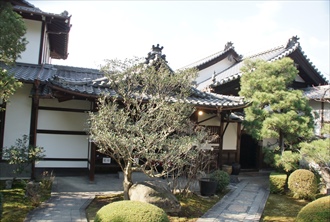 東福寺境内の北西に塔頭・一華院(いっけえん)がある。寺号は達磨大師の「一華五葉を開き、結果自然と成る」に因る。 臨済宗東福寺派。本尊は白衣観音坐像。 ◆歴史年表 南北朝時代、1382年/応永年間(1394-1427)、東漸健易(とうげん/とうざん-けんえき)の開創によるという。開基は不明。 1544年、創建されたともいう。 中世(鎌倉時代-室町時代)、一時廃絶する。 江戸時代、1808年、塔頭・霊雲院の天瑞により再興された。 1821年、霊雲院12世・矢瑞守選により再興されたともいう。 ◆東漸建易 南北朝時代-室町時代前期の臨済宗の僧・東漸健易(とうげん/とうざん-けんえき、1344-1423)。詳細不明。遠江(静岡県)の生まれ。義堂周信に学ぶ。鎌倉・寿福寺の華峰僧一の法を嗣ぐ。摂津・広厳寺、東福寺、南禅寺の住持を歴任した。応永年間(1394-1427)、東福寺・一華院を開創する。語録『一華東漸和尚語録』『東漸和尚法語集』。80歳。 4代将軍・足利義持と親交した。 ◆天瑞 江戸時代後期の臨済宗の僧・天瑞(てんずい、?-?)。詳細不明。南禅寺・春江和尚の弟子?。塔頭・霊雲院に入る。1808年、東福寺・一華院を再興する。 ◆矢瑞守選 江戸時代後期の臨済宗の僧・矢瑞守選(?-1823)。詳細不明。霊雲院12世。1821年、東福寺・一華院を再興する。 ◆仏像 本尊は室町時代作の「白衣観音坐像」を安置している。 脇仏に江戸時代作の「阿弥陀如来坐像」、江戸時代作の「達磨半像」を安置する。 ◆一華五葉 寺号の一華院とは「吾れ本(も)と茲(こ)の土に来たり、法を伝えて迷情を救う。一華五葉を開き、結果自然(じねん)に成る」に因る。禅宗の初祖・達磨大師(5世紀後半-6世紀前半)が二祖・慧可(えか、487-593)に伝えた伝法偈(でんぽうげ)中の一句とされる。 開運吉祥の語という。ただ、本来の意味は、一つの花があり、五つの花弁が開いた。花とは心中深く開く自身の花である。もしも「五つの花弁」の意味を知りたければ、禅を実践するしかない。その五弁の意味とは、ありのままを受け入れる心、純粋な心、分け隔てのない心、人を想う心、すべてはおかげさまといただける心を意味する。自らの心中を尋ね、自らの力でそれを会得する。その行は、心に美しさと、自らの生を限りなく豊かに導くに違いないと諭すものという。 ◆文化財 近代、1881年、東福寺が焼失し、その類焼を免れた南北朝時代の大仏蓮華台の花弁の一つが残されている。塔頭に一枚ずつ配布された中の一つになる。創建時の東福寺の仏殿には、釈迦如来(15m)の大仏が安置されていたという。 ◆庭園 方丈の南に枯山水式庭園「依稀松(いきまつ)の庭」がある。奥の刈込、その背後の楓などの樹林を前にして長方の苔庭が東西に広がる。庭は、方丈内より眺める額縁庭園として構成されている。左手(東)に一本の松が植えられ、その片方の枝を右手(西)に向けて長く伸ばしている。石組はなく、松を囲むように苔地に方丈より飛石、延段が曲線を描いて向かい戻る。中央に蹲踞、南西に塔灯籠も配されている。ツツジ、ドウダンツツジなどの大小の丸刈込、西の高い生垣には椿などの植栽も見られる。 依稀松の名の由来は、禅語の「依稀松屈曲彷彿石爛班」に因る。松の枝ぶりがよく似るにしても、松は龍を象るものではなく、曲がった松そのものである。石の斑紋は似るにしろ、石は虎ではなく石そのものである。「依稀松」とは、ただ「一本の枝の伸びた松」に過ぎない。庭は、松を松として石は石として、ありのままの姿に鑑賞することを説くものという。 ◆年間行事 紅葉の頃に一般公開され、茶席が設けられる。 *普段は非公開 *年間行事は中止・日時・内容変更の場合があります。 *年号は原則として西暦を、近代以前の月日は旧暦を使用しています。 *参考文献・資料 『旧版 古寺巡礼京都 18 東福寺』、『京都の禅寺散歩』、『京都・山城寺院神社大事典』、『京都大事典』、当院ウェブサイト 、ウェブサイト「コトバンク」 ![]() ![]() ![]() ![]() |