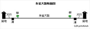 二条駅近く千本通の東に、「此附近 平安京大内裏 朱雀門址」の碑が立てられている。この地には、平安時代、平安京の大内裏南面にあり、最も重要で、最大の門といわれた朱雀門(すざくもん/すざかもん/