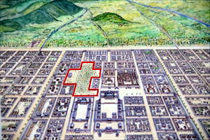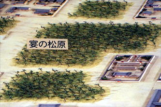 ![]() 「宴の松原」の石標 ![]() 京都市埋蔵文化財研究所・京都市考古資料館の説明板 ![]() 宴の松原(赤い点の部分)、その南に豊楽院、説明板より ![]() 説明板より ![]() 【参照】平安時代宴の松原復元図(京都市平安京創生館)、案内パネルより |
