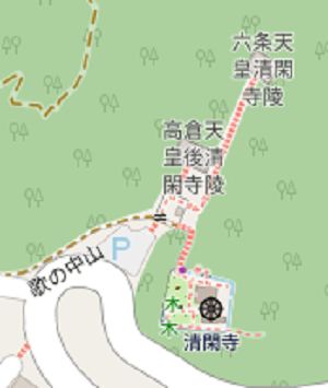 ![]() 「六條天皇陵」「高倉天皇陵」の石標 ![]() 清閑寺稜 ![]() 清閑寺稜、紅葉 高倉天皇陵、六条天皇陵、清閑寺、 OpenStreetMap Japan |