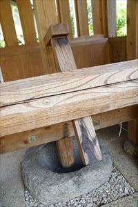 ![]() ![]() 「露山水車」の額 ![]() ![]() 水輪 ![]() 杵・桁(杵の突起部分)、回転棒、臼 ![]() 近くの音羽川 |