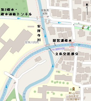 山科区安朱(あんしゅ)地区では、安祥寺川(あんしょうじ-がわ)上に琵琶湖第1疏水(山科疏水)の水路橋が架けられている。北から南へ流れる川と東から西に流れている疏水が立体交差している。 交差点のすぐ北側には、安祥寺川中に4段堰があり、付近の地下には第2疏水のトンネルが通水している。 ◆歴史年表 近世(安土・桃山時代-江戸時代)中期以前、山科川は櫃川(ひつかわ)と呼ばれていた。 近代、1885年、第1琵琶湖疏水(山科疏水)の建設が始まる。安祥寺川は改修され水路を変えた。 1887年、安祥寺川に水路橋が架けられ、河川上を琵琶湖疏水(山科疏水)が流れる現在の立体交差になった。 1890年、琵琶湖疏水が完成している。 ◆山科疏水・安祥寺川 東山山麓の東に広がる山科盆地は、かつて二毛作地帯だったという。疏水が開削される以前には、東西の山側に河川は無かった。このため、灌漑用水の多くは溜池に頼っていた。 近代、1885年に第1琵琶湖疏水の建設が始まる。安祥寺川は改修され、水路を変えた。1887年に安祥寺川の上を琵琶湖第1疏水(琵琶湖疏水)が流れる現在の立体交差になる。南北方向に流れている安祥寺川を跨ぐ形で、東西方向のアーチ橋(煉瓦造の水路橋、水路閣)が築かれた。この橋上を疏水が流れる。 疏水の通水後は、山科北部の山間からの谷水、河川の流れは疏水により遮られた。このため、東の藤尾-山科間には数カ所の分水口が設けられ、疏水から南の山科盆地側に疏水の水を分流している。 ◆第2疏水・疏水連絡トンネル 安祥寺川の4段堰下付近には琵琶湖疏水第2疏水(地下トンネル)が通水している。 この第2疏水(1912年完成)と第2疏水連絡トンネル(1999年完成)は、安朱地区東端の地下で合流している。 地上部はすべて埋立水路になっており、安祥寺川の東側は地上部の施設、児童公園(馬場ノ東児童公園、馬場ノ西児童公園)などに利用されている。 ◆安祥寺川 近世中期以前に、安祥寺川(あんしょうじ-がわ)は櫃川(ひつ-かわ)とも呼ばれていた。旧安祥寺川、山科川の下流を呼んだ。平安時代中期の私撰集に「ねぶれ共袖ひつ川のうづ巻に恋しき人の影なかりけり」(『古今和歌六帖』)と詠まれている。 旧安祥寺川は、かつて山科川の主流だった。山科北部から南西に流れ、山科盆地の西縁低所に流路があった。現在の山科駅北西の御陵山ノ谷に水源があり、南下し厨子奥を経て、条理遺構に沿い一直線に南に流れ下った。川田、西野山、栗栖の経て、勧修寺付近で山科川に合流していた。長さ3.5km。 現在の安祥寺川は、旧流路の東側になる。水源は東山、大文字山の南斜面にあり南流している。山科盆地北縁の安祥寺地区では、第1疏水の水路橋下を潜っている。山科駅の北で南西に流れを変え、さらに南流している。1kmの地点で新幹線高架を潜り、山科川に合流している。 ❊原則として年号は西暦を、近代以前の月日は旧暦を使用しています。 ❊参考文献・資料 「京都市の駒札」、『琵琶湖疏水の歴史散歩』、『京都大事典』、ウェブサイト「コトバンク」、 OpenStreetMap    |