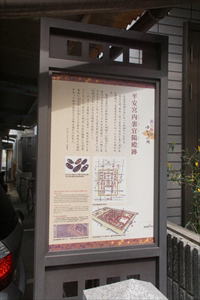 浄福寺通下立売上ルに平安宮 内裏 宜陽殿跡(へいあんきゅう-だいり-ぎようでん-あと)の石標、京都市の「源氏物語ゆかりの地」の説明板がある。 平安時代、この地には宜陽殿があり、天皇所持の書物・歴代の御物が収蔵されていた。議所では公卿会議が行われた。 ◆歴史年表 平安時代、この地に宜陽殿が建てられた。 827年、その存在が確認できる。 現代、2007年、12月、全京都建設協同組合創立50周年記念として石標を立てる。 2008年、3月、京都市は「源氏物語ゆかりの地」の説明板を設置した。 ◆宜陽殿 宜陽殿(ぎようでん)は、平安京内裏十七殿の一つになる。儀陽殿とも記した。紫宸殿の東、綾綺殿の南にあった。南にある春興殿と並び、西側にある校書殿(きようしよでん)、安福殿とは相対した。内裏造営時からあった建物とみられている。 母屋を塗籠(ぬりごめ)につくり、納殿(おさめどの)と呼ばれた。天皇所持の書物、楽器、甲冑などの歴代の御物が収蔵されていた。当時の一級品が納められており、『枕草子』には、累代の楽器を誉めて、「宜陽殿の一の棚に」置かれるものという言い方があったと記されている。 紫宸殿とは軒廊(こんろう、屋根付きの渡廊)で繋がっていた。西庇の北側には公卿座、北庇は脇陣、次将座、東庇には大臣宿、上官宿などがあった。南庇の西側には議所があり、叙位・除目(じもく)の際の公卿会議が行われた。 西面、東西2間、南北9間、4面に庇、東に孫廂付、檜皮葺。 ◆源氏物語 『源氏物語』第34帖「若菜上」では、兵部卿宮(ひょうぶきょうのみや)が弾いた琴は宜陽殿の御物になっている。 ❊年号は原則として西暦を、近代以前の月日は旧暦を使用しています。 ❊参考文献・資料 京都市の説明板「源氏物語ゆかりの地」、ウェブサイト「京都のいしぶみデータベース-京都市」、ウェブサイト「コトバンク」    |