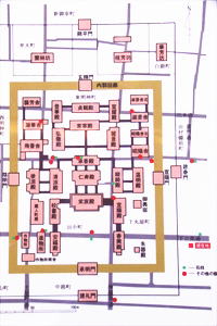 ![]() ![]() 平安宮復元図、現在地は右下の赤字部分、黄土色の四角部分は内裏内郭回廊、「源氏物語ゆかりの地」の説明板より ![]() ![]() ![]() 『源氏物語』・「宿木」、ROIS-DS人文学オープンデータ共同利用センター |