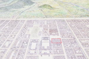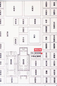 京都市埋蔵文化財研究所・京都市考古資料館の説明板![]() 平安京復元図、現在地は赤字部分、その上に内裏、京都市埋蔵文化財研究所・京都市考古資料館の説明板より ![]() 平安宮復元図、現在地は赤い四角の部分、京都市埋蔵文化財研究所・京都市考古資料館の説明板より ![]() 右の説明板下の縦線が中務省東面築地跡の中央線(南北線) |