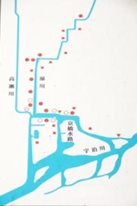 ![]() 角倉了以水利紀功碑 ![]() 角倉了以水利紀功碑 ![]() 角倉了以水利紀功碑 ![]() 副碑 ![]() 説明版 ![]() 江戸時代の高瀬川(左上)、濠川(その右)、現在地は2川の合流点付近、説明版より ![]() 濠川 濠川、伏見であい |