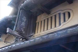 ![]() ![]() ![]() 大看板、ガス燈 ![]() 大看板 ![]() 大看板の彫り物、一文字瓦 ![]() 虫籠(むしこ)窓 ![]() ガス燈 ![]() 屋根の起(むく)り ![]() 出格子窓 ![]() 看板 ![]() ![]() 家紋「秦」 ![]() ガラス戸 ![]() ![]() 【参照】「油小路通り」の通名板 |