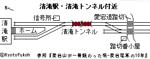 清滝の愛宕山参道、二の鳥居近くに、ケーブルの清滝川駅跡(きよきがわ-えき-あと)がある。かつてこの地に、愛宕山鉄道鋼索線(あたごやま-てつどう-こうさくせん)、略称「(愛宕山ケーブル)」の駅舎が建てられていた。ケーブル線は、現在もなお日本最長になる。 愛宕山鉄道は平坦線(嵐山駅-清滝駅)・鋼索線(清滝川駅-愛宕駅)の2路線からなり、「愛宕電車」、略称「愛電」とも呼ばれていた。 ◆歴史年表 近代、1909年、7月、清滝川水力電気株式会社により清滝発電所が運用開始した。 1921年、愛宕山登山の鉄道敷設計画案が提案される。 1927年、8月1日 、実業家・風間八左衛門らにより、愛宕山鉄道株式会社が設立される。 1928年、6月、平坦線・鋼索線の工事が着工される。教育者・中山再次郎の指導により、愛宕神社の奥に愛宕スキー場の建設が始まる。 1929年、1月 、鋼索線建設資材運搬用の貨物用架空索道(ロープウェイ)が開業する。(『鉄路五十年』)。4月12日、愛宕山鉄道平坦線(嵐山駅-清滝駅)が開業した。4月14日、開通式が挙行される。7月25日、鋼索線(ケーブル)(清滝川駅-愛宕駅)が開業する。8月2日、愛宕山に山上テント村、12月、愛宕スキー場が完成する。 1929年-1933年、世界大恐慌などにより業績が悪化した。 1930年、7月20日、愛宕遊園内に愛宕山ホテル・飛行塔が開業になる。12月、業績悪化に伴い従業員削減などが行われる。労働争議が起きたという。 1931年、貨物用架空索道が廃された。 1935年、10月18日、京阪電気鉄道より正式に車両を購入している。 1937年、2月、日独合作映画「新しき土」が公開された。平坦線・鳥居本駅がロケ地になった。 1939年、1月、愛宕スキー場に中山再次郎の胸像が立てられる。 1941年、4月11日、 平坦線で省線山陰線(現・JR嵯峨野線)との交差部分に嵯峨西駅が新設された。 1942年、最盛期を迎える。2路線で年間99.4万人の輸送実績があった。 1943年、夏より、間引き運転が始まった。12月3日、 戦時体制下の軍事徴用のため、不要不急線指定が下される。平坦線・鋼索線は廃線対象路線になった。 1944年、1月11日 、平坦線は鉄材供出のため単線化された。2月11日、鋼索線は廃止になる。愛宕スキー場・愛宕山ホテル・清滝遊園地・愛宕遊園も廃された。11月1日、平坦線で人身事故が起きた。12月11日、平坦線も廃止される。廃止翌日より、代替バスの嵐山バス(現・京都バス)が、愛宕参道経由で鳥居本まで運行開始になる。 1945年、2月26日、平坦線の実際の運転停止になったという。6月5日より、 平坦線清滝トンネル跡は、三菱重工業京都機器製作所「清滝トンネル工場」として、航空機機体工場第14工場に転用された。8月15日、終戦を迎える。 現代、1949年、10月、京都バスは清滝まで臨時延長運転する。 1950年、4月 、京都バスに清滝までの路線延長認可が下りた。 1959年、10月31日、愛宕山鉄道株式会社は解散する。 1960年、5月、旧平坦線(釈迦堂駅-清滝駅)の旧軌道敷に清滝道(嵯峨釈迦堂藤ノ木町-清滝道三条交差点)が完成した。 1967年、ケーブルカー復活の計画が発表される。実現はしなかった。 1970年、4月18日、旧平坦線の旧平坦線(嵐山駅-釈迦堂駅)の軌道敷を利用し、新たに嵐山高架道路(府道29号線、宇多野嵐山山田線)が開通した。 ◆風間 八左衛門 近代の政治家・実業家・風間 八左衛門(かざま-はちざえもん、1879-1942)。旧名は嘉一。京都の生まれ。父・醤油商「鍋屋」・風間八左衛門の長男。1888年、八左衛門を襲名し家督を相続する。桂村会議員、京都府農会長、広島瓦斯専務取締役・三国紡績常務取締役・帝国石油・愛国生命保険・日本活動写真・桜セメント各取締役、帝国工業・太湖汽船各社長、嵯峨銀行監査役などを歴任した。1920年、第14回衆議院議員総選挙で、京都府第3区から立憲政友会所属で出馬し当選1期を務めた。1925年-1942年、族院議員に互選され3期在任した。1927年、愛宕山鉄道株式会社の設立に加わり、社長に就く。63歳。 ◆土井 万蔵 近現代の機械技術者・土井 万蔵(どい-まんぞう、1883-1965)。兵庫県揖保(いぼ)の生まれ。藤永田造船所の技師になる。1918年頃、独立し、大型遊具を専門にする「土井文化運動機製作所」を大阪に設立した。「サークリング・ウエーブ(心棒から円環状の座席を吊りあげ、回転させる遊具)」を製作する。同年、東京上野・電気博覧会にサークリング・ウエーブを出展し、国産第1号とされる。1920年、千里山花壇に飛行塔を設置している。1925年、国産観覧車を建設した。1929年、奈良生駒山上遊園地に飛行塔を設置した。(現存日本最古の大型遊具)。1930年、愛宕山遊園地に飛行塔を設置する。その後、飛行塔は各地に急速に広まったという。83歳。 大型遊戯機械製造を国産化し、「飛行塔の創始者」「大型遊戯機械の父」とされる。 ◆中山 再次郎 近現代の教育者・中山 再次郎(1867-1963)。父・福井松平藩士の4男。1875年、8歳の時、父の死去に伴い、母とともに東京に転居した。1893年、東京帝国大学国史科を卒業する。旧制高田中学校の教頭、1900年、