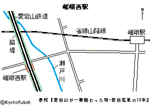 ![]() 旧清滝川駅(左)、清滝川、京都愛宕研究会の説明板より