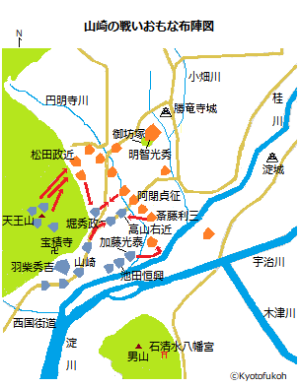 乙訓郡大山崎町の京都縦貫自動車道(国道478号)の高架下に「天王山夢ほたる公園」がある。敷地内に、「天下分け目の天王山(てんのう-ざん) 山崎合戦古戦場(やまざきかっせん-こせんじょう)」の石標が立てられている。 安土・桃山時代に、天王山の麓に流れる円明寺川(えんみょうじ-がわ、現・小泉川)を挟んだ現在地一帯が主戦場になり、豊臣秀吉の軍と明智光秀の軍が戦い、秀吉軍が大勝している。 この山崎の戦い(やまざき-の-たたかい)は、天王山の戦とも呼ばれ、以後、秀吉は全国統一への主導権を握った。 ◆歴史年表 安土・桃山時代、1582年、旧6月2日、本能寺で織田信長が明智光秀の反逆にあって自刃した。 旧6月3日、羽柴(豊臣)秀吉は信長の死を知る。 旧6月12日、秀吉軍は摂津国富田(とんだ、大阪府高槻市)まで進軍、着陣した。 旧6月9日、光秀は下鳥羽に出陣した。 旧6月10日/11日、光秀は秀吉接近の報を受け、淀城・勝龍寺城に退いて布陣した。 旧6月13日、山城国乙訓郡大山崎村周辺の天王山麓で、円明寺川(現・小泉川)を挟み両軍は対陣した。夕方に戦いが始まり秀吉軍が圧勝する。 現代、2011年、3月、大山崎町教育委員会により石標が立てられた。 ◆豊臣 秀吉 室町時代後期-安土・桃山時代の武将・豊臣 秀吉(とよとみ-ひでよし、1537-1598)。男性。幼名は日吉丸、初名は木下藤吉郎。小猿と呼ばれた。父・尾張国(愛知県)の百姓、織田信秀の足軽・木下弥右衛門、母・百姓の娘・なか(天瑞院)。1551年、家出し、後に今川氏の家臣・松下之綱、1554年、織田信長に仕える。1561年、浅野長勝の養女・ねねと結婚し、木下藤吉郎秀吉と名乗った。戦功を重ね、1573年、小谷城主、羽柴姓と筑前守、信長の天下統一にともない西国転戦した。1582年、備中高松城の毛利軍と戦いの最中に本能寺の変が起こり和睦した。軍を返し山崎で明智光秀を討つ。1584年、小牧・長久手で織田信雄、徳川家康の連合軍に敗れる。1585年、紀州根来と雑賀、四国・長宗我部元親を服した。関白に進む。1586年、聚楽第、広寺大仏造営に着手し、太政大臣に昇り豊臣の姓を賜わる。1587年、九州征討、聚楽第が完成する。10月、北野天満宮で北野大茶湯を催した。1588年、第107代・後陽成天皇が聚楽第を行幸する。検地、刀狩を行う。1590年、小田原の北条氏直らの征討、朝鮮使を聚楽第に引見した。1591年、利休を自刃させる。1592年、文禄の役を始めた。甥の養子・秀次に関白職を譲り、太閤と称した。1593年、側室淀殿に秀頼が生まれると、1595年、秀次を謀反人として切腹させ、妻妾子女らも処刑した。1597年-1598年、朝鮮を攻めた慶長の役に敗れた。1598年、3月、醍醐寺で「醍醐の花見」を行う。8月、伏見城で没した。62歳。 「普請狂」と称された。京都で「都市改造」を行う。1585年-1591年、洛中検地・洛中地子免除(1591)、1586年よりの方広寺大仏建設、1586年-1587年、聚楽第・周辺の武家邸宅街建設、1589年、禁裏・公家町の修造整備、1590年、新町割建設(短冊形町割)、1590年、三条大橋などの橋梁・道路建設、1591年、御土居築造、寺院街(寺町・寺之内)建設、1595年、方広寺大仏、1597年、伏見城を建てた。ほか、関所廃止、楽市・楽座制、重要都市・鉱山直轄、貨幣鋳造、太閤検地・刀狩、伏見の城下町化、宇治川の整備、倭寇取締、朱印貿易などを進めた。没後、豊国廟に豊国大明神として祀られた。 ◆高山 右近 室町時代後期-江戸時代前期のキリシタン大名・茶人・高山 右近(たかやま-うこん、1552-1615)。幼名は彦五郎、名は長房、友祥、重友、通称は右近大夫、右近允(うこんのじょう)。洗礼名はジュスト(ユスト)。摂津国(大阪府)高山の生まれ。父・大和沢城主・高山友照(図書[ずしょ]、洗礼名ダリオ)、母・洗礼名マリアの嫡男。高山には多くのキリシタンが住んでいた。その後、父が大和・沢城主に任じられ榛原に移る。1564年、12歳で日本人のロレンソより洗礼を受け、洗礼名はユスト(ジェスト)だった。1568年、右近父子は和田惟政に仕え、摂津・芥川城を預かる。1570年、右近父子は高槻城の惟政家臣頭になる。1571年、白井河原の戦いで惟政が討死する。右近父子は馬塚、糖塚を守る。1573年、和田惟政の子・惟長と右近父子は対立し、惟長が暗殺を謀る。右近父子は荒木村重の支配下に入り、村重の命により惟長を討つ。右近も重傷を負う。父に譲られ高槻城主になる。この頃、村重に茶道を指南され茶の湯を深めた。1574年、上洛したイエズス会上長・カブラルの教理を受けた。高槻に天主堂を建てる。摂津余野城主・黒田の娘・ジェスタと結婚する。1576年、京都・南蛮寺の建立に尽力した。領内でイエズス会宣教師・オルガンティーノ神父を招き復活祭が祝われた。1577年、領地高槻などで1年間に4000人の領民が洗礼を受けた。1578年、村重の信長への謀反により、当初、右近は村重への忠誠を示した。妹、長男を人質に出す。信長は右近に降伏を要求し、パードレ(伴天連、バテレン)らを軟禁した。オルガンティーノの勧めで右近は降伏し、高槻城を無血