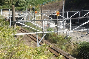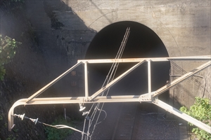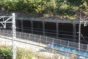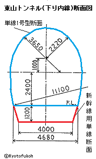 現JR西日本の東山トンネル(隧道)は、京都市山科区北花山寺内町-東山区今熊野南日吉町間にある。複々線になっており、単線断面トンネル4本が並行して開坑している。 このうちの下り内線は、戦前に計画された新幹線(弾丸列車)の遺構の一つになる。 ◆歴史年表 近代、1914年、12月31日、東海道線の新線工事が着工される。 1916年、5月1日 、東山トンネルの上り線の東西両坑口より工事が着手された。 1920年、1月、東山トンネル(山科村上花山)で用水漏水ある。(「京都日出新聞」)。7月29日、上り線導坑①、8月24日、下り線導坑②が貫通する。 1921年、5月11日、上り外側線①・上り内側線②の2本(単線二線並列)が竣工した。8月1日、東海道線(京都-大津線)が開通した。(『大鉄局史』) 1941年、7月、3本目のトンネル(現・下り内線)③の掘削が始まる。 1943年、1月、新幹線増設工事(弾丸列車)の京都駅設置が決定する。 1944年、6月、弾丸列車計画は中止になる。8月、3本目のトンネル(現・下り内線)③が竣工した。10月31日、膳所-京都間は3線化される。 現代、1965年6月-1970年3月、京都-草津間の複々線化工事が着工・完成した。 1969年、4本目の下り外線④が完成した。 2005年、 東山トンネル・新逢坂山トンネルは、土木学会選奨土木遺産に選定される。 ◆野村 彌三郎 近代の鉄道官僚・野村 彌三郎(?-?)。詳細不明。男性。鉄道院理事を務めた。 ◆長谷川 謹介 近代の鉄道官僚・鉄道技師・長谷川 謹介(はせがわ-きんすけ、1855-1921)。男性。長門国(山口県)の生まれ。大阪英語学校を卒業した。鉄道官僚・井上勝に認められ、1874年、鉄道寮に入る。1877年、京都-大津間の鉄道工事建設事務に当たる。日本人による初めての鉄道工事の竣工だった。1883年、工部省一等技手になる。1884年、欧州に出張し、1886年、技師になる。その後も鉄道技師として天竜川橋梁・台湾縦貫鉄道などを完成させた。1892年、一旦官を辞し日本鉄道技師、1899年、台湾鉄道敷設技師長、運輸長・汽車課長を経て、1902年、台湾総督府鉄道部長になる。1908年、欧米各国を視察し、創設された鉄道院技師になる。のち東部・西部・中部の鉄道管理局長などを歴任した。1916年、技監、1918年、副総裁を務めた。66歳。 ◆島 秀雄 近現代の鉄道技術者・機械工学者・島 秀雄(しま-ひでお、1901-1998)。男性。大阪府の生まれ。父・鉄道技術者・島安二郎。1925年、東京帝国大学工学部機械工学科卒業後、鉄道省に入省した。国鉄(現・JR)の動力近代化を推進し、「D51」などの蒸気機関車の設計を手がける。1937年、ヨーロッパを視察した。1940年、鉄道省本社工作局車両課に配属される。新幹線(弾丸列車)車両開発の責任者になる。1946年、「高速台車振動研究会」を発足させる。1950年、工作局長の時、長距離電車「湘南電車(80形)」に関わる。1951年、通勤電車「63形」が炎上した桜木町事故の責任を取る形で国鉄を退任し、住友金属工業に入社した。1955年、国鉄総裁・十河(そごう)信二に請われ国鉄に復職し、国鉄理事技師長に就任する。以後、東海道新幹線立案・建設に尽力した。1957年、通勤電車「モハ90」などを開発する。1958年、ビジネス特急「こだま(151系)」に関わる。1960年、毎日工業技術賞を受章した。1964年、国鉄を退任する。 1965年、朝日賞を受章した。1967年、アメリカのスペリー賞を受賞した。1969年-1977年、宇宙開発事業団(現・宇宙航空研究開発機構)初代理事長を経て、同事業団顧問に就任した。1969年、ジェームズ・ワット国際ゴールドメダルを受賞し、文化功労者、1971年、勲一等瑞宝章を受章した。1977年、退任後も同事業団・科学技術庁の顧問を務めた。 1994年、文化勲章を受章する。著『D51から新幹線まで―技術者のみた国鉄』。96歳。 「新幹線の生みの親」といわれている。 ◆東山トンネル 東山トンネルとして、現在は4本のトンネル(上り外線・内線、下り外線・内線)がある。 ◈近代、1921年5月11日に、上り外側線①・上り内側線②の2本(単線二線並列、延長1864.8m)が竣工した。1916年4月の達第432号で制定された乙型断面の規格が採用されている。手掘りであり、一部に削岩機が導入された。坑門意匠は新逢坂山トンネル(1921年5月11日竣工)と類似し、 装飾的要素が色濃い。煉瓦・石組による。 ◈近代、1940年-1944年に東海道本線の輸送力増強のため、大津市の膳所(ぜぜ)-京都間の上り線1線の増設(3線化)工事が着工された。戦時下の物資不足状況でも軍事的理由が優先された。突貫工事により勤労奉仕も動員される。 1941年7月に、東山トンネル東坑口で3本目のトンネルの掘削が新たに始まる。在来線用の単線1号型断面(単線断面トンネル規格)による。1942年1月には西坑口より405m 地点に立坑が設けられた。 掘削方式は「底設導坑先進式半断面工法」であり、山岳トンネル工法が採用された。切羽(掘削面)の高さを半分ずつにする安定した施工法になる。最初に、トンネル下部(底設、切羽下部)に狭い導坑を掘りながら前進する。トンネル上部半分を掘削し、土砂(ズリ)は下の導坑に落としていく