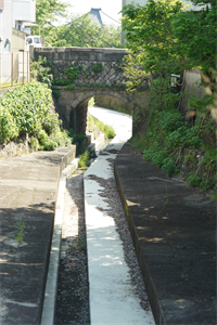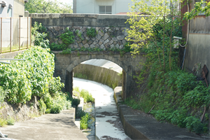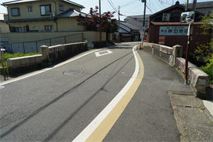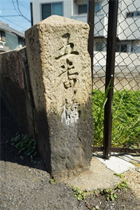 淀の「五番ノ橋(ごばん-の-はし)」は納所(のうそ)川に架けられた石橋であり、五番橋とも呼ばれた。 前史として、樋門(ひもん)の変遷がある。 ◆歴史年表 かつて、現在地付近には納所川に架かる「悪水門樋」があった。(「城州島羽海道四塚町より淀小橋迄絵図」) 近代、1881年、2月、現在地にあった「五番の樋」は石造の樋門になった。(「日出新聞」)。それより以前には木樋だったという。 1908年、5月、淀川改修工事に伴い、桂川堤防(現在の五番樋門の地)に新たに樋門が設けられた。(『京都府紀伊郡誌』) 1912年、6月、現在地に現在の五番ノ橋(五番橋)が架橋された。(親柱の銘、『旧橋梁台帳』) 1915年、現在の五番樋門の地に、「五番の樋」と記され樋門が設けられていた。(『京都府紀伊郡誌』) 1931年、五番樋門が改修されている。(「五番樋門改修工事の図面」) ◆樋門 かつて、現在地付近には納所川に架かる「悪水門樋」があった。(「城州島羽海道四塚町より淀小橋迄絵図」) 納所町五番には樋門(ひもん) が設けられており、御杖村の内一口(いもあらい)の池より、淀裏町川に通じていた。近代、1881年2月に、元は木樋だった樋門が石造の樋門になったという。(「日出新聞」、1887年9月3日付) 樋門とは、 河川から用水を取水し、排水路の水を河川へ流し、舟運などのために堤防を横断して造られた暗渠(通水路)をいう。樋管(ひかん)とも呼ばれる。水門が設けられており、水位を調節した。 1907年に淀川改修工事が行われた。それ以前に、上鳥羽・下鳥羽・横大路・伏見・納所の各地区が共同し、1908年5月に樋門が設けられている。(『京都府紀伊郡誌』)。これは、現在の五番ノ橋の西に在り、橋とは別に桂川堤防に新設された樋門になる。 1912年6月には、石橋の「五番ノ橋」が現在地に架橋されている。(『旧橋梁台帳』)。これが、現在の石橋になる。 1931年には、桂川の「五番樋門」の改修工事が行われた。(「五番樋門改修工事の図面」)。なお、図面には納所川に橋が架けられており、これが現在の五番ノ橋とみられる。 ◆五番ノ橋 近代、1912年6月に石橋の五番ノ橋は、鳥羽街道(千本通)の納所(のうそ)川に南北方向に架けられた。川は淀古城の堀跡といわれている。 「五番ノ橋」の橋名について、鳥羽街道に沿う付近一帯には、「一番町」から「九番町」と呼ばれる地名が残っている。この番号は、江戸時代の朝鮮通信使のための番役などの割り振りだったという。その中の一つ五番町に由来しているとみられている。 石橋の構造は2層の積み方になり、上部は大きめの方形・長方形・五角形などの石を谷積みにする。下部はやや小ぶりの方形・長方形の石を煉瓦様に横積みしてアーチを作る。高欄はかつてコンクリート壁・笠石だったともいう。 橋長9 m、幅員6.5m。路線名は千本通。 ❊年号は原則として西暦を、近代以前の月日は旧暦を使用しています。 ❊参考文献・資料 ウェブサイト「京都市橋りょう長寿命化修繕計画-別冊資料京都市管理橋りょう一覧」、ウェブサイト「淀城跡 納所 水垂-京都市埋蔵文化財研究所」、『明治の橋』、ウェブサイト「コトバンク」 |