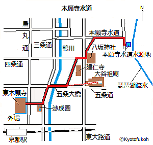 蹴上インクライン最上部付近、蹴上船溜近くに「本願寺水道水源地(ほんがんじ-すいどう-すいげん-ち)」が現存している。東本願寺を本山にする真宗大谷派が管理している。 近代に入り、琵琶湖疏水を利用し、東本願寺(下京区)の防火用水として整備された。 ◆歴史年表 近代、1894年、7月、本願寺水道の第1期工事(水源池-市街地-東本願寺間の配管)は着工された。同年に水源地は完成した。 1895年、3月、第1期工事は完成する。4月、第2期工事(東本願寺境内地の配管)が始まる。 1897年、8月、第2期工事は完成した。8月3日、東本願寺境内で「噴水防火大試験」が行われている。 現代、1950年、11月、京都駅舎失火に際し、京都市消防局は東本願寺外堀(本願寺水道による送水)で消防用水を調達した。 1979年、東本願寺境内の消火設備が一新され、本願寺水道による送水が終了した。以後も、東本願寺外堀、渉成園池には引き続き送水された。 2008年、老朽化・漏水のため本願寺水道の送水が全面停止される。 2025年、本願寺水道は国の重要文化財に指定された。 ◆田邊 朔郎 江戸時代後期-近代の土木工学者・田邊 朔郎(たなべ-さくろう、1861-1944)。男性。江戸の生まれ。父・洋式砲術家・田邊孫次郎の長男。1861年、朔郎が9カ月の時、父が病死する。その後、生活困窮する。1868年、戊辰戦争を逃れ武州幸手に移る。1869年、叔父・太一のもとに移る。1871年、太一が外務省任官になりその援助を受けた。1874年、東京に戻り、湯島天神下の「共慣義塾」で英語、漢学、数学を学んだ。1875年、工学寮付属小学校に入学した。1877年、工部大学普通科に入学する。2年後、私費生として工部大学校土木科(東京大学工学部の前身)で学ぶ。1881年以来、京都での実地調査に基づく、実地科卒業論文「琵琶湖疏水工事の計画」を執筆した。土質調査の際に右手を負傷し、左手だけで製図、測量して書いている。叔父の破産後、借金して学業を続け、1883年、工部大学校を卒業した。卒論が京都府知事・北垣国道の目に留まる。請われて京都府疏水准判御用掛として採用され、琵琶湖疏水工事に従事する。1885年、疏水事務所の工事担当として疏水工事が着工した。1886年、疏水事務所の工事部長になる。1887年、工師として全体責任者になった。1888年-1889年、アメリカ合衆国に出張し、水力配置法の取調、ポトマック運河、モリス運河、リン市電気鉄道の調査を行う。1890年、琵琶湖疏水が完成する。疏水工事概要を作成した。国道の長女・しずと結婚した。媒酌人は榎本武揚だった。帝国大学工科大学教授に就任した。1891年、蹴上発電所が完成する。工学博士を授与される。1892年、震災予防調査会委員に任じられる。疏水工事報告書について英国土木学会より、テルフォード・メダルを授与される。1893年、内務省土木会委員に任じられた。1894年、義父・国道の依頼により北海道に出張し、北海道鉄道敷設のための調査を行う。1896年、東京帝大を退任し、北海道庁鉄道部長として官設鉄道の計画・建設にあたる。1897年、臨時北海道鉄道敷設事務調査嘱託に任命された。1898年、北海道鉄道部長に任命され、北海道に移る。1900年、ロシア・シベリア鉄道工事を視察した。アメリカ合衆国を訪ねる。鉄道部長を辞し、創設された京都帝国大学理工科教授に就任した。1901年、京都市土木顧問を兼務し、市の三大事業計画を推進する。1910年、京都帝国大学教授に就任した。京都市名誉顧問になる。1916年-1823年、京都帝国大学工科大学長に就任した。1923年、土木学会会長に就任する。1924年、京大名誉教授になる。勲一等瑞宝章を受章した。1929年、東京・万国工業会議副議長、土木文化会議委員長に推された。1938年、京都市から有功者として表彰された。 米国鉄道協会会委員、アメリカ合衆国土木会会員になる。編纂委員長として『明治工業紙』(全10巻)(1925-1931)に関わる。著『明治以前日本土木史』(1936)は日本土木史の基本文献になっている。81歳。 詩歌、漢詩文、書画、琴を嗜み、工事関連の石片を蒐集した。 墓は大日山墓地にある。顕彰碑(京都市長寄付の黒御影石)には「希英魂永留本市」と刻まれている。傍らに夫人・静子の墓もある。立像が疏水公園内に立つ。 ◆本願寺水道 東本願寺は江戸時代だけでも4度の大火に遭っている。江戸時代後期、1788年の京都大火、1823年の失火、1858年の京都大火、1864年の禁門の変(蛤御門の変)だった。 ◈ 近代、1880年頃より東本願寺の再建が始まる。これを契機に、防火設備の導入が検討された。1890年に、京都府技師・田邊朔郎(1861-1944)は、東本願寺側から琵琶湖疏水を利用した防火施設構想の相談を受けた。 1894年7月に防火用水として「本願寺水道」工事は着工される。蹴上(左京区)の琵琶湖疏水を水源とし、西の水源地(貯水池)より東本願寺まで送水する設備だった。設計・総監督は田邊、工事監督は技師・竹内忠三(?-?)による。 本願寺水道は防火設備であり、日本初の設計になった。自然水利を用い、 動力に頼らず高低差による高水圧