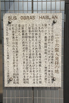 京都四条病院(堀川四条下ル東側)の壁面に「SUS OBRAS HABLAN 二十六聖人発祥の地」の銘板がある。"SUS OBRASHABLAN