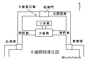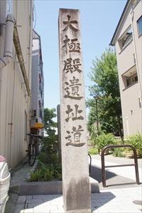 千本丸太町交差点北西の内野児童公園内に、「大極殿遺蹟(たいごくでん-いせき)」という巨大な石碑が立つ。 平安時代、794年の平安京遷都に際し、南北の大通りだった朱雀大路(現在の千本通)を中心とし、この付近に朝堂院がありその正殿である大極殿も置かれた。 朝堂院の西には、饗宴施設である豊楽院、北東に天皇の居所内裏があった。ほか二官八省の官衙が建ち並び、内裏の西に宴松原という空間があった。 ◆歴史年表 奈良時代、793年、大極殿の建設が始まる。 平安時代、794年、10月、第50代・桓武天皇は京都に移り、平安京遷都の詔を下した。11月、「山背国」から「山城国」に改めた。 795年、大極殿は完成する。その後、周囲に殿舎が建て増しされる。 796年、元日、桓武天皇は、大極殿で最初の朝賀を受けた。 806年、造都事業は中止される。 815年、大極殿の大掛かりな修理が行われている。 876年、大極殿が焼失した。(第一次大極殿) 879年、再建される。 880年、地震により基壇北西隅が破損した。 899年、台風により大極殿内の高御座が傾倒した。 1057年、鴟尾が落下する。 1058年、大極殿が焼失した。(第二次大極殿) 1072年、大極殿が再建される。 1157年、大内裏が修造される。大極殿も修理される。 1177年、安元の大火で大極殿が焼失し、以後、再建されなかった。(第三次大極殿) 鎌倉時代、1212年、「火出で来て西北に至る。はてには、朱雀門・大極殿・大学寮・民部省などまで移りて」と記されている。(『方丈記』) 1227年、平安宮の火災後、内裏は再建されることはなかった。その後、跡地は荒野(内野)と化した。 安土・桃山時代、1587年、豊臣秀吉は、かつての大内裏の位置に聚楽第を築造した。 1588年、秀吉は聚楽第に第107代・後陽成天皇を迎える。 1595年、聚楽第は破却される。 近代、1895年、平安遷都1100年を記念し、「大極殿遺蹟」が建立された。 現代、1959年、平安京内初の本格的な発掘調査が、内野児童公園内で実施される。 1994年、千本通の電話線布設工事に伴う立会調査で、大極殿基壇の一部、南側の階段跡が見つかる。大極殿北端の位置が確定した。 2006年、発掘調査により、緑釉瓦が出土した。鬼瓦、鴟尾(しび)の一部は、三彩技法が用いられていることが判明する。 2008年、3月、京都市は「源氏物語ゆかりの地」の説明板を設置した。 2017年、2月、国の史跡に追加指定された。 ◆桓武 天皇 奈良時代-平安時代の第50代・桓武 天皇(かんむ-てんのう、737-806)。男性。父・白壁王(のちの第49代・光仁天皇)、母・高野新笠(たかの-の-にいがさ)は、百済の武寧王を祖先とする百済王族の末裔という。名は山部(やまべ)。皇位継承者ではなかった。772年、光仁皇后井上内親王が廃后、その子・他戸親王も廃太子され、773年、立太子された。781年、即位、同母弟・早良親王を皇太子に立てた。これらには藤原百川の画策があった。784年、平城京より長岡京遷都、785年、造長岡宮使長官・藤原種継暗殺事件に伴い、早良親王を廃太子に追う。794年、平安京再遷都した。百済王氏出自を官人などに重用、坂上田村麻呂を征夷大将軍とし、蝦夷侵略の兵を送る。最澄や空海を保護する一方、既存仏教を圧迫した。山陵は当初、宇多野(右京区)とされたが、柏原山陵(伏見区)に改められた。70歳。 ◆和気 清麻呂 奈良時代末期-平安時代初期の官僚・和気 清麻呂(わけ-の-きよまろ、733-799)。男性。備前国(岡山県)の生まれ。父・乎麻呂。姉は広虫(法均尼)、子は広世、真綱、仲世など。女帝・称徳天皇の寵愛を受け、右兵衛少尉、764年、藤原仲麻呂の乱の功により勲6等を授けられた。766年、従五位下、近衛将監。769年、皇位に就こうと画策した道鏡による宇佐八幡宮神託事件(道鏡事件)で、広虫の代わりに宇佐に派遣されこれを阻止した。だが、称徳天皇により大隅国に配流された。770年、光仁天皇即位に伴い召還される。桓武天皇により、783年、摂津職の長官に任じられる。788年、中宮大夫、民部大輔も兼ね、美作・備前国国造。長岡京よりの遷都を桓武天皇に上奏した。796年頃、平安京造宮大夫に任じられた。799年、従三位民部卿兼造宮大夫。67歳。 ◆藤原 小黒麻呂 奈良時代末-平安時代前期頭の官人・貴族・藤原 小黒麻呂(ふじわら-の-おぐろまろ、733-7943)。男性。父・北家・藤原鳥養(とりかい)、母・大伴道足の娘の次男。藤原房前(ふささき)の孫。娘・上子は第50代・桓武天皇の後宮。764年、恵美押勝(えみのおしかつ)の乱の功により従五位下になる。伊勢守、式部少輔などを経て、光仁朝で、779年、参議になる。780年、陸奥での伊治呰麻呂(いじのあざまろ)の乱で、藤原継縄(つぐただ)に代わり征東大使になる。成果はなかった。781年、陸奥出羽按察使(あぜち)を兼ね兵部卿になった。京都に戻り功により正三位を授けられた。782年、光仁天皇の没後、御装束司になり誄(しのびごと)を奉じた。784年、中納言になり、藤原種継らとともに長岡京遷都のために山背国乙訓(おとくに)郡長岡村を視察した。のち中務卿、皇后宮大夫などを