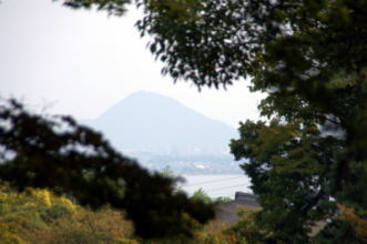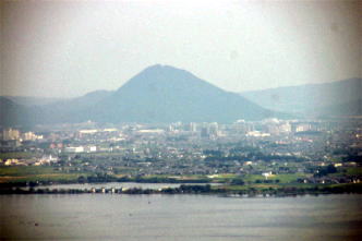 ![]() 山頂からの琵琶湖の眺望、近江富士といわれる三上山が正面の樹間に見える。 |