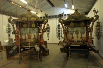 ![]() 樹下神社拝殿に置かれた牛尾宮神輿(左)と三宮神輿 |