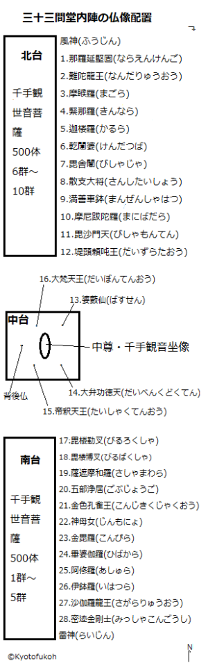 蓮華王院(れんげおう-いん)は、「三十三間堂(さんじゅうさんげん-どう)」とも称される。境内は、総延長524mの築地塀に囲まれ、25073㎡の敷地を有している。平安時代に、後白河法皇(第77代)が法住寺殿内に建立した堂宇のうち、唯一残るものが三十三間堂になる。 蓮華王院の蓮華王とは千手観音であり、千手観音の御堂を意味している。「頭痛山平癒寺」ともいわれ、浄瑠璃話より楊枝加持で頭痛から免れるという信仰が生まれた。 天台宗妙法院門跡の境外仏堂になる。本尊は十一面千手千眼観世音菩薩(千手観音坐像)を安置している。 本尊は洛陽七観音の一つ。洛陽三十三観音巡礼第17番札所。 後白河法皇に因み頭痛平癒の信仰がある。夜泣泉近くの夜泣き地蔵は、子どもの夜泣きを治すとの信仰がある。天台宗三門跡(ほかに蓮華王院[三十三間堂]・三千院・青蓮院)の一つ。「ミシュラン・グリーンガイド・ジャポン 3つ星観光地(諸仏像も3つ星)」(改訂第4版)に選ばれている。 ◆歴史年表 平安時代、988年、右大臣・藤原為光の私邸「法住寺」が造営される。円融上皇(第64代)が列して落慶法要を営む。本堂には金色丈六釈迦如来、薬師如来、観音、延命、如意輪観音菩薩などを安置していた。その東西に普賢菩薩を安置した法華三昧堂、阿弥陀世尊を安置した常行三昧堂が建ち並んだ。(『日本紀略』『扶桑略記』) 989年、為光は亡き夫人、985年に急逝した息女・き子の菩提を弔うために法住寺を建立した。 992年、為光の死にあたり封戸100戸が寺に寄進された。その没後、寺は子孫によって守られる。(『日本紀略』) 1032年、九条邸よりの火の手で焼失する。(『日本紀略』) 1156年、中納言入道(清隆とも)による法住寺堂が営まれた。(『兵範記』)。第77代・後白河天皇が方違いにより当地に行幸する。(『山槐記』)。寺の跡地に隠棲の庁、法住寺殿を造営する。御所内に仏堂である蓮華王院を設け、その本堂である三十三間堂を建てた。この頃、楊枝浄水供が初めて修法される。 1160年、法住寺殿に新熊野・新日吉両社が鎮守社として建立される。後白河上皇は御所に常住し、「蓮華王院御所」とも呼ばれた。昌雲が別当になる。法住寺殿に新熊野・新日吉両社が鎮守社として建立される。上皇は御所に常住し、「蓮華王院御所」とも呼ばれた。 1161年、後白河上皇によって後院の東山御所(法住寺御所、七条御所)が造営された。西殿、北殿も記されている。(『山槐記』同年条)。旧4月、法皇は藤原顕長邸(八条堀川)より移り住する。新日吉社荘園の一つが昌雲に下賜される。 1164年、後白河上皇の発願により、平清盛の寄進で、鳥辺山麓(阿弥陀ヶが峰)の後白河上皇の法住寺殿一角に、南殿北に鎮守寺の蓮華王院仏堂が建てられた。長大な建物で当初は、「法住寺千体観音堂」と呼ばれる。上皇が出家した懺法堂も建立される。千体像も完成する。この頃、宝蔵も建立されたという。旧12月、300人の僧により落慶供養が営まれる。導師は興福寺別当・尋範、咒(しゅ)願は天台座主・俊円が務めた。僧・聖賢が鐘楼を寄進する。清盛は、私財を投じた功により備前守に任じられた。(『愚管抄』『醍醐寺雑事記』巻9) 1165年、諸堂が建てられた。僧・承仕が夢告により境内築山に、醴泉(れいせん)を発見する。 1167年/1166年、後白河上皇は、法住寺南殿に移る。新御堂、不動堂が落慶になる。(『兵範記』)。また、1167年、南殿に周防守季盛が改造し移る。 1169年、後白河上皇は、園城寺長吏・覚忠により受戒し、法皇になり法住寺の仏堂に住した。不動堂が建立されたともいう。 1172年、法住寺殿内に法皇の妃・建春門院(平滋子)のために、最勝光院(東山区新熊野)が建立された。 1173年、蓮華王院は観音霊所十か寺のひとつに挙げられる。建春門院(平慈子)の願により、園地の西に最勝光院、法華堂が建てられた。北殿が焼失する。 1174年、15夜にわたって法住寺御所南殿で「今様合」開催された。第80代・高倉天皇は法住寺殿に方違の行幸をした。不動堂について記されている。(『吉記』) 1175年、八幡以下全国21大社を勧請した蓮華王院総鎮守社(蓮華王院惣社)が勧請されている。(『百錬抄』) 1176年/1175年、法住寺南殿南東の山上に美作守雅隆の寄進により千手観音堂(小千手堂、9間3面)が建てられる。千体の観音仏が安置されたという。高倉天皇が行幸する。後白河上皇の女御・建春門院(平滋子)が亡くなり、女御の御陵として法華堂が建てられた。(『玉葉』)。 1177年、旧12月、蓮華王院念仏堂(東法華堂)、五重塔が落慶になる。法皇は100日に渡る長公講堂での法華八講を修する。(『玉葉』)。五重塔供養の際に、仏師・康慶は造仏の総指揮の功により法橋に叙せられた。子・運慶も造像に関わる。 1178年、中宮・平徳子の安産を祈願した。 1183年、旧7月、木曽義仲が入京し、行家と共に蓮華王院に参上し、平氏追討を命じられる。以後、京中の狼藉の取り締まりが委ねられた。旧11月、義仲は法住寺を襲撃し法住寺御所、南殿は焼失した。(法住寺合戦)。だが、三
