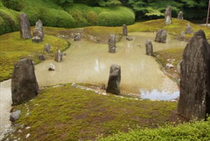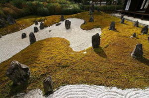 光明院(こうみょう-いん)は、東福寺塔頭のひとつであり、東福寺の南にある。作庭家・重森三玲の庭で知られ、「苔の寺」とも呼ばれている。 臨済宗東福寺派。 ◆歴史年表 創建、変遷の詳細は不明。 南北朝時代、1391年、金山明昶(きんざん-みんしょう、明祖禅師)の開創による。 近代、1868年、神仏分離令後の廃仏毀釈により荒廃する。 1911年、横幕滴泉(よこまく-てきせん)住持の入寺により再興された。20年以上にわたる托鉢が続けられ、現在の本堂が建立された。 1939年、作庭家・重森三玲により、方丈前に「波心の庭(波心庭)」が作庭された。 現代、1962年、重森三玲により「雲嶺庭」の作庭が完成する。 ◆金山 明昶 南北朝時代-室町時代中期の僧・金山 明昶(きんざん-めいしょう/みょうしょう、?-?)。男性。諡号は明祖禅師。詳細不明。大道一以の法嗣。明より帰国後、播磨・円応寺、淡路・安国寺、駿河・清見寺、但馬・宗鏡寺などを創建した。応永年間(1394-1427)、城崎・極楽寺を開基したという。 ◆重森 三玲 近現代の作庭家・重森 三玲(しげもり-みれい、1896-1975)。男性。本名は計夫。岡山の生まれ。1911年、15歳で茶道、華道を学ぶ。1914年、18歳で茶室・露地を設計する。1917年、日本美術学校で日本画を学び、生花、茶道を習得、文化・芸術、宗教・哲学にも関心をもつ。1922年、文化大学院の創設を企図する。1923年、関東大震災に被災し岡山に還る。1926年、フランスのミレーに憧れ、自ら三玲と改名した。1929年、京都に移る。1931年、日本花道芸術学園を設立する。1932年、日本庭園の研究団体「京都林泉協会」会長となる。華道草月流の創始者、勅使河原蒼風(1900-1979)らと生花の革新を唱え、1933年、「新興いけばな宣言」を起草した。1936年-1938年、全国の庭園の実測調査を行う。1949年、前衛的な生花の創作集団「白東社」を主宰し、前衛生花作家・華道家の中川幸夫(1918-2012)も参加した。1950年頃より、アメリカ合衆国の彫刻家、画家のイサム・ノグチ(Isamu Noguchi、1904-1988)と交流を深めた。78歳。 全国200あまりの作庭に関り、本格的に作庭した京都では、東福寺方丈庭園(1943)に始まり、京都林泉協会30周年記念の瑞峯院庭園(1961)、最後の作品は松尾大社庭園(1975)になった。1936年以来、独自に全国の庭園実地調査を行う。それらの結果をまとめた第一次調査『日本庭園史図鑑』(1939年完、全26巻)、1971年よりの第二次調査『日本庭園史大系』(1976年完、全35巻)が刊行されている。 ◆庭園 ◈ 方丈前の庭園(1150㎡)は、近現代の作庭家で庭園研究家・重森三玲の近代、1939年作による。池泉式の枯山水庭園で、「波心の庭(波心庭)」といわれる。「虹の苔寺」「東山の苔寺」とも呼ばれる。 白砂は海を表し、苔に配置された小石は波飛沫を表す。波心とは、禅語の「無雲生嶺上。有月落波心」に由来する。「雲は嶺上(りょうじょう)に生ずることなくんば、月の波心に落つる有り」。煩悩がなければ、月(仏心)は波に映るの意味という。 主に立石で構成され、大小75石配されている。苔の低い築山と州浜型の白砂の枯池、3組の石組(三尊石組)がある。それぞれの3つの石柱が、釈迦三尊、阿弥陀三尊、薬師三尊を表す。さらに、3組の三尊石が庭全体としても三尊石を構成する。また、三尊石の主石から放射状に、すべての石が並べられている。これは光明(後光)が放たれる様を石で表したという。石は滋賀県南郷の洗堰産による。 苔庭の美しさから、「虹の苔寺」とも呼ばれる。州浜は、平安時代の毛越寺(岩手県平泉)、また天龍寺の影響が見られるという。枯山水式に州浜を取り入れた初めての例とされる。州浜に囲まれた白砂は海を表し、海洋を表した初例という。州浜の緩やかな曲線と法面には、古典的な手法である飛沫に見立てた栗石(丸い小石)が打ち込まれている。 庭園背後(東)には全国から集められたサツキ、ツツジの大刈り込みがあり、これらは雲紋を表している。 石庭は、本堂、書院、茶室各室のいずれの方角からも鑑賞できるような石組に凝らされている。さらに、東の高台雲上には、茶亭「蘿月(らげつ)庵」が建つ。高台からも庭園全体を俯瞰することが考慮されている。茶室それ自体が月を意味し、丸窓は月が昇る姿を象る。茶室には露地がある。 ◈ 山門入り口付近に、重森三玲が現代、1962年作庭した前庭「雲嶺庭」がある。白砂、苔地、青石の三尊石、鶴島、青石の破片の敷石、インカ風の敷石などで構成されている。 ◆茶室 高台の雲上には茶亭「蘿月(らげつ)庵」(1963)が建てられ、庭を見下ろす。重森三玲の設計による。禅語の「雲は嶺上に生ずることなく、月は波心に落つること有り」に因むとものという。 窓、壁、障子すべてが月を表し、土壁に白い線で大きな円が描かれている。庭園より眺めると、東の空に月昇る様を表す。露地がある。 ◆文化財 ◈「固山一鞏墨蹟 清源寺家訓 観応三年(1352年)六月廿七日」1巻 (重文)、南北朝時代、1352年がある。京都国立博物館寄託。 ◆桜楓 春に桜、ツツジ、サツキ、秋に