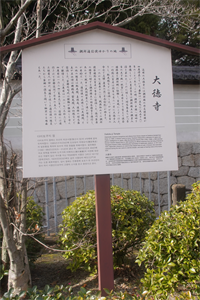 紫野(むらさきの)にある大徳寺(だいとく-じ)は、洛北随一の禅宗寺院になる。「茶人面/ 茶面(ちゃづら)」といわれ、茶の湯との関わりは深い。朝廷との関わりも深い。他門の僧の入寺を許さない独自の禅道場であり、鎌倉幕府を背景にした五山派に対し在野の立場をとった。 山内は22万5000㎡(6万8000坪)の広大な境内を有している。23の塔頭がある。末寺は204か寺ある。正式には大本山大徳寺という。山号は龍寶山(りゅうほうざん、竜宝山)という。 臨済宗大徳寺派の大本山。本尊は釈迦如来。 「ミシュラン・グリーンガイド・ジャポン 3つ星観光地」(改訂第4版)に選ばれている。大徳寺・大徳寺方丈庭園は、「美しき日本-いちどは訪れたい日本の観光遺産」(日本交通公社、1999年)の一つに認定された。 ◆歴史年表 平安時代、紫野の地には、第53代・淳和天皇(786-840)の離宮紫野院が営まれていた。 雲林院の菩提講という寺があり、紫野の地にあることから当初は「紫野寺」ともいわれた。(『大鏡』) 11世紀(1001-1100)、慈雲院などが建立される。 鎌倉時代末期、1319年/1315年-1319年/1315年/1324年/1326年、宗朝禅を唱える宗峰妙超(しゅうほう-みょうちょう)は、東山・雲居庵を去る。甥の赤松則村(円心)父子の帰依を得て、これを「大徳」とし、紫野に小堂「大徳(大徳庵)」を建立した。小庵(大徳庵)を寄贈され、東山より移ったことに始まるともいう。 1323年頃、宗峰妙超は、花園上皇(第95代、持明院統)に召され禅籍を講義する。(『花園天皇宸記』) 1324年、第96代・後醍醐天皇(大覚寺統)より、雲林院辺(菩提講東塔)の土地を寄進される。(「妙超請文」)。寺地は拡大し、伽藍の建造が始まる。 1325年、宗峰妙超は禁裏での旧仏教側との宗論「正中の宗論」を論破した。(「大灯大国師行状」)。玄慧法印は妙超に就き、居宅に方丈を建てる。花園法皇は、持明院統(後の北朝)の祈願所に指定する。(「花園上皇院宣」)。大覚寺統(後の南朝)の後醍醐天皇も勅願道場に院宣(命令の文書)を下した。(「後醍醐天皇綸旨」)。両統の帰依を受け、大徳寺は公的に寺格を与えられた。公卿・中御門経継は、播磨国小宅荘内三職を寄進する。(「中御門経継寄進状」) 1326年、皇室外護により、宗印尼は法堂を完成させる。妙超は龍宝山大徳寺と命名した。勅使を迎え開堂の式をあげた。公的な大徳寺の始まりになる。その後、寺領、末寺の寄進が相次ぐ。 1329年、鎌倉幕府の祈願所になる。 1330年、播磨国小宅三職の寺領を得る。妙覚寺本堂、堂舎の敷地を得た。 南北朝時代、1333年、隠岐から帰洛した第96代・南朝初代・後醍醐天皇は、五山別格の「本朝無双之禅苑」の宸翰(自筆文書)を与える。宗峰妙超の一流相承禅林(開山門流による寺院相続)とした。(「後醍醐天皇綸旨」)。五山の一に加えられる。この頃、7600石の土貢が入る寺領を有した。(「後醍醐天皇宸翰御置文」)。後醍醐天皇の祈願所になる。 1334年、旧10月、後醍醐天皇は、大徳寺を京都五山に列しさせ、第1の南禅寺と同列の上刹(じょうせつ)とした。建武新政権によって京都中心の五山制度が定められる。寺域(東は船岡山東崎、南は安居院大路、西は竹林、北は同山後社)を安堵する。(「後醍醐天皇綸旨」)。信濃伴野庄など一円不輸寺領になる。 1335年、後醍醐天皇が行幸する。命により官池を掘る。宗峰妙超は寺規十条を制した。 1336年、花園上皇(第95代)は、宗峰妙超により印可を受ける。光厳上皇は播磨国小宅三職などを安堵した。 1337年、花園法皇は、住持を宗峰妙超の一流相承(開山門流による寺院相続)とする。(「花園上皇御宸翰御置文」)。徹翁義亨を1世とした。大燈禅の道場になる。 1338年、徹翁は徳禅寺を開創した。 1341年、足利直義は京都五山より大徳寺を外した。また、大徳寺は自ら官刹から離脱し、より広範な布教のために十刹の下の「林下」(りんげ、格外)になり在野の禅寺になる。 1358年、北朝4代・後光厳天皇は荒廃していた大徳寺、龍翔寺を再興する。(「後光厳天皇綸旨案」) 1368年、徹翁義亨は大徳寺法度を制定する。(「大徳寺寺務定文」)。寺院経済、徹翁派による寺勢を確立する。 応安年間(1368-1375)/1370年とも、言外宗忠により如意庵が創建される。 1386年、旧7月、室町幕府3代将軍・足利義満の五山制度改定に伴い、大徳寺は北朝に付いたとして官刹(かんさつ)の「五山十刹」のうち京都十刹の第9位に落とされる。以後、官寺になり五山派に属した。住持の宗峰一流相承が崩される。 1390年、7世・言外宗忠の没後、その塔所として山内初の塔頭・如意庵が創建される。 室町時代、第96代・後醍醐天皇の建武中興の挫折により、大徳寺は幕府に南朝方と見られ、次第に衰微した。 1431年、養叟宗頤は幕府に願い出て、大徳寺は再び官刹から外れ、弁道所として在野の林下(りんげ)の禅寺になる。私寺に再び戻る。(「中正仲方書状」)。一流相承刹の禅寺になった。 1433年、大用庵が建てられる。 1453年、義天玄詔は大徳寺に紫衣で開堂する。全山が焼失した。塔頭・如意庵、大用庵のみが