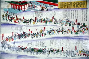 岡崎にある平安神宮(へいあん-じんぐう)は、近代になり創建された。京都市の氏神として崇敬されている。 主祭神は、平安京遷都を行った平安時代の第50代・桓武天皇。東京遷都により平安京最後の天皇になった江戸時代の第121代・孝明天皇の二座を祀る。旧官幣大社。 神仏霊場会第113番、京都第33番。四神相応の京(みやこ)京都五社めぐりの一つ、中央。 家内安全、厄除開運、心身健康、厄除、縁結びなどの信仰を集めている。 「ミシュラン・グリーンガイド・ジャポン1つ星観光地」(改訂第4版)に選ばれている。平安新宮・時代祭は、「美しき日本-いちどは訪れたい日本の観光遺産」(日本交通公社、1999年)の一つに認定された。「京都市のバリアフリー・車椅子の方にもおすすめできる神社・寺院スポット一覧 (10件)」(介護アンテナ)の一つに選ばれている。 ◆歴史年表 近代、1892年、経済学者・田中卯吉の神宮建立の進言が市議会で可決された。 1893年、9月2日、大極殿地鎮祭が行われる。(「平安遷都紀念祭紀事」) 1894年、7月1日、立柱式行われる。7月2日、官幣大社に列することが決定した。(平安遷都紀念祭紀事)。本殿、大極殿、応天門、青竜楼、白虎楼などが完成した。桓武天皇を祀る神宮創立の請願が許される。立柱式が営まれ、平安神宮として官幣大社に列せられた。山県有朋の命により、小川治兵衛が造園に着手する。 1895年、3月15日、竣工し、地鎮式が行われた。(「平安遷都紀念祭紀事」)。平安京大内裏(だいだいり)の正庁、朝堂院(八省院)を縮小して復元される。官幣大社に列せられた。平安遷都1100年記念の「内国勧業博覧会開催記念事業内国勧業博覧会」が開催される。時代祭が始まる。9月、平安講社設立される。10月22日、平安遷都1000年紀念祭・第1回時代祭が行われる。(「京都日出新聞」) 1896年、平安神宮に平安京会が設立される。(「京都日出新聞」) 1897年、時代祭で、先頭に山国隊が配備された。(「京都日出新聞」) 1908年、旧京都市美術館敷地が社地に編入される。10月、神宮前で「三大事業起工奉告祭」が催された。(「大阪朝日新聞」) 1912年、京都御所より泰平閣、尚美館が移築された。6月15日、三大事業の祝賀式典が平安神宮で行われる。 1913年、西神苑、中神苑が完成する。 1928年/1929年、大鳥居が竣工した。(「大阪朝日新聞」) 1938年、孝明天皇の合祀の儀が出される。 1940年、10月20日、皇紀2600年を記念し、祭神に第121代・孝明天皇が合祀された。(「京都日出新聞」)。本殿、祝詞殿、翼舎、神楽殿(儀式殿)、額殿、内外歩廊、斎館、社務所などが増改築される。 現代、1946年、9月、連合軍総司令官・マッカーサー夫人が神苑を訪れた。 1950年、10月22日、7年ぶりに時代祭が再興された。(「京都新聞」) 。京都薪能が始まる。 1968年、南神苑が完成する。 1975年、主要社殿の屋根が葺替になる。神苑が国の名勝に指定された。 1976年、1月、本殿部分が焼失している。 1979年、4月、本殿が再建された。 1994年、百年祭記念館、時代祭衣裳祭具収蔵庫が建てられた。社殿朱塗り工事行われる。 2018年、9月、台風21号により神苑で被害が出る。 2024年-2030年、大極殿、東西歩廊、白虎楼、蒼龍楼、応天門などの塗り直し・耐震工事が行われる。 ◆桓武 天皇 奈良時代-平安時代前期の第50代・桓武 天皇(かんむ-てんのう、737-806)。男性。山部(やまべ)。柏原亭。父・白壁王(後の第49代・光仁天皇)、母・高野新笠は、百済の武寧王を祖先とする百済王族の末裔という。皇位継承者ではなかった。764年、従五位下に叙される。766年、従五位上大学頭になる。770年、父の即位により親王宣下、四品。772年、光仁皇后井上内親王が廃后、その子・他戸親王も廃太子され、773年、立太子になる。775年、井上内親王、他戸親王は死に追われる。780年、伊治呰麻呂(いじのあざまろ)の反乱が起こる。781年、旧3月、即位、同母弟・早良親王を皇太子に立てた。これらには藤原百川の画策があった。旧5月、藤原小黒麻呂征夷戦勝の報告を許さなかった。784年、旧6月、長岡遷都の工事が始まる。旧11月、平城京より長岡京に遷都した。785年、旧9月、造長岡宮使長官・藤原種継(たねつぐ)暗殺事件に伴い、早良親王を廃太子に追い、乙訓寺に幽閉させる。旧10月、親王を淡路に流す途中で親王は亡くなる。旧11月、安殿親王(あてのみこ)が立太子になる。789年、蝦夷大使・紀古佐美の軍を東北に派遣し、蝦夷の指導者・阿弖流為(アテルイ)に衣川で敗走する。(第一次蝦夷征伐)。791年、蝦夷大使・大伴麻呂の軍を派兵する。(第二次蝦夷征伐)。793年、葛野に行幸した。新京宮城(平安京)の造営が始まる。794年、旧10月、新京に再遷都した。旧11月、山背国を山城国に改め、新京を平安京にした。797年、坂上田村麻呂を征夷大将軍に任じ、胆沢、志和を確保した。(第三次蝦夷征伐)。800年、旧7月、神泉苑に行幸する。早良親王に祟道天皇を追尊した。804年、再び田村麻呂を征夷大将軍として、第四次の蝦夷征討が準備された。遣唐船発遣、805年、公卿に徳政相