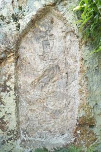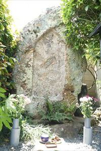 嵯峨中又町(なかまた-ちょう)の下立売通の南、生垣の中に、「安堵の塔(あんど-の-とう)」という石碑が立つ。日蓮の孫弟子・日像ゆかりの題目卒塔婆という。日像の号「竜(龍)華寿院」に因み「ルルゲ(竜華)さん」とも呼ばれている。 災難を避ける功徳があるという。 ◆歴史年表 鎌倉時代、1314年、日像は、車折神社の社頭で、法華経の布教を行った。その時、他宗の迫害があり、近くの兜塚(冑塚、甲塚)古墳に身を隠し難を逃れたという。その後、感謝して題目石塔婆を立てたという。(駒札)。 また、日像が京都七口に立てた石卒塔婆の一つともいう。 ◆日像 鎌倉時代中期-南北朝時代の日蓮宗の僧・日像(にちぞう、1269-1342)。肥後房、肥後阿闍梨、号は竜華寿院という。下総国(千葉県・茨城県)に生まれた。7歳で日蓮の六大弟子の一人・日朗に師事した。1275年、身延の日蓮の弟子になり、経一丸と命名され本尊を授与する。1282年、日蓮没後、日朗に再び師事した。1293年、北陸を経て、1294年、入洛し、日蓮の遺命により日蓮宗最初の京都弘通(ぐつう、布教)、宗義天奏(天皇への布教)を行う。松ヶ崎・歓喜寺(妙泉寺)、洛西・真経寺、深草・極楽寺(宝塔寺)を日蓮宗に改宗させた。柳酒屋仲興(やなぎざかや-なかおき)ら町衆に信徒拡大し、一時の京都は「法華題目の巷」と呼ばれた。1307年頃、乙訓山崎付近で布教を行う。比叡山延暦寺などの圧力により、1307年、土佐配流、1308年、紀伊流罪になる。1311年、綾小路大宮(下京区)付近に、拠点の法華堂が建立されたとみられている。妙顕寺を開創し、教団発展の礎を築く。1321年、第96代・後醍醐天皇より弘通の勅許を得る。今小路に法華堂を移し、妙顕寺の起源ともいう。京都での日蓮宗最初の道場になる。同年、洛内追放になる。3度の弾圧と赦免「三黜三赦(さんちつさんしゃ)の法難」を受けた。著『秘蔵集』など。74歳。深草・宝塔寺に葬られる。 一門は四条にあり、四条門流と呼ばれた。1358年、弟子・大覚の祈雨の功により菩薩号が贈られた。 ◆安堵の塔 ◈ 鎌倉時代、1314年の春、日像が車折神社(右京区)の社頭で、法華経の布教を行った。その時、他宗の迫害を受けた。近くの兜塚(冑塚、甲塚)古墳に身を隠し、難を逃れる。その後、感謝し、古墳の石蓋に波動(なみのり)の題目を刻んで立てたという。 高さ220㎝、幅150㎝、厚さ95㎝。 ◈ また、日像が京都七口に立てた石卒塔婆の一つという。表面に「南無妙法蓮華経」と刻んでいる。 ◈ なお、碑の東に流れている有栖(ありす)川には、かつて「安堵橋(あんどばし)」が架けられていた。現在は「甲塚橋(かぶとづかばし)」と呼ばれている。 この「安堵」とは、空海にまつわる「阿刀(あと、阿刀氏)」よりの転訛ともいう。かつて、嵯峨・清凉寺で火災があり、比叡山衆徒が駆け付けた。橋の袂で宝樹寺の本尊が無事であり、安堵したことから名付けられたという。(『都名所図会』巻4)。 ◆冑塚古墳 「冑塚古墳(かぶとづか こふん)」(右京区嵯峨甲塚町)は、安堵の塔の南東に位置している。民家敷地内にあり、「兜塚」「甲塚」とも記される。 平地に築かれた円墳で、後期古墳、横穴式になる。南を正面にし、側面から見ると冑の形をしており、名の由来になった。封土は崩れている。羨道、玄室は残る。径38m、高さ5.5m。 現在は、稲荷神を祀る祠がある。 *年号は原則として西暦を、近代以前の月日は旧暦を使用しています。 *参考文献・資料 駒札、『昭和京都名所図会 4 洛西』、ウェブサイト「コトバンク」 |