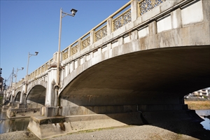 現在の七条大橋(しちじょう-おおはし)は、鴨川に架かる現存の橋の中ではもっとも古い。土木学会により土木遺産に認定されている。 ◆歴史年表 平安時代、七条通は平安京の七条大路にあたる。西の端は山陰街道に通じていた。七条大路には、東西の市が面し、門前には市姫の社(市比姫売神社の前身)が祀られていた。 江戸時代、七条河原には、中州を挟んで2つの橋が架けられていた。その後、1本の七条橋になる。 1654年、鴨川に架かる11の橋の一つとして七条口(七条橋)の記載がある。(『新版平安城東西南北町井洛外之図』) 1670年、京都所司代・板倉重矩の寛文の新堤築造により、後に鴨川西岸高瀬川との間、五条(1761年の五条新地)-七条(1717年の七条新地)に遊郭が生まれた。 近代、1883年、10月28日、木橋が落成し、通行許可になる。 1886年、木橋が洪水により流出し、新たに架け替えられる。 1871年より、京都府は橋の修繕費として地車1両につき50文の通行料を徴収した。 1872年、10月、七条仮橋で旅人から橋銭を取る。 1895年、第4回内国勧業博覧会の開催に際し、橋の拡張工事がおこなわれる。3月4日、開通式が行われた。 1898年、京都市の管理になった。 1903年、改修される。 1911年、11月、現在の橋が着工する。 1913年、3月、現在の七条大橋が市電事業に伴い架橋された。4月12日、竣工し、15日、渡初式が行われる。 1935年、6月、「鴨川大洪水」では、橋の流出はなかった。護岸が破壊されている。 太平洋戦争(1941-1945)中、波模様の高欄、照明灯が金属供出により一度撤去される。 現代、1978年、最後まで残っていた市電の七条線(東山七条-京都駅間)が廃止された。 1979年-1987年、京阪電車、琵琶湖疏水の地下化工事が行われる。橋長が112.8mより82mに減じた。 1986年、木造高欄より現在の高欄意匠に修景された。 2008年、土木学会により選奨の土木遺産に認定される。 2019年、3月29日、国の登録有形文化財に指定された。 ◆板倉 重矩 江戸時代前期の大名・板倉 重矩(いたくら-しげのり、1617-1673)。男性。幼名は長命、通称は又右衛門、内膳正(ないぜんのかみ)。父・板倉重昌(しげまさ)、母・林吉定の娘の長男。1637年、島原の乱で父・重昌と共に九州へ赴く。重昌は戦死し、重矩は戦功を上げる。軍律に違反し一時逼塞させられた。1639年、三河(愛知県)深溝(ふこうず)藩主・板倉家(2代)を継ぎ、三河中島藩主に転じた。大坂定番を経て、1665年、老中になる。1668年-1670年、京都所司代になる。1669年、鴨川に寛文新堤を築いた。1670年、老中に再任される。1672年、下野(しもつけ)(栃木県)烏山藩主・板倉家初代になる。57歳。 所司代として朝廷からも厚い信任を得ていたという。 ◆柴田 畦作 近現代の建築家・柴田 畦作(しばた-けいさく、1873-1925)。男性。岡山県の生まれ。1896年、東京帝国大学工科大学卒。九州鉄道会社技師になる。後に、第3高等学校教授、第5高等学校教授を経て、東京帝国大学工科大学助教授、教授になる。東大に開設された鉄筋コンクリート講義の担当教授だった。ドイツ、フランス、アメリカ合衆国に留学した。1905年、工学博士の学位を受けた。国内で初めて鉄筋建築を研究し、応用力学・構造学に造詣深く、本格的な「鉄筋コンクリート建築の祖」といわれた。著『工学力学』。53歳。 設計に福島県原町市の鉄筋無線送信所主塔、京都の近代化の礎になった「三大事業計画」の道路拡幅、市営電気軌道敷設に関する研究にも関わった。四条大橋、明治神宮の神橋、東大本郷キャンパス理科大学化学教室なども設計している。 ◆森山 松之助 近現代の建築家・森山 松之助(もりやま-まつのすけ、1869- 1949)。男性。大阪市の生まれ。父・外交官・貴族院議員・森山茂。学習院、攻玉社を経て、1893年、第一高等学校を卒業後、1897年、東京帝国大学工科大学建築学科を卒業し、大学院に進学した。辰野金吾に師事した。1898年、第一銀行建築係嘱託になる。1900年、東京高等工業学校の建築学講座担当した。後藤新平に見いだされ、1906年-1921年、日本統治下の台湾総督府営繕課技師になる。1908年頃、台湾初になる鉄筋コンクリート造の台北電話交換所を設計した。台湾では10数件の官庁建設に関与している。1911年、三井物産横浜支店の設計をする。1912年、欧米などの視察を行う。帰国後、1922年、森山松之助建築事務所を開設した。 現存する作品としては、1908年の台北水道水源地喞筒室(自來水博物館)(市定古跡)、1924年の東京・久邇宮邸(聖心女子大学パレス ) (重文)、1929年の諏訪市・片倉館会館・浴場・渡廊下(重文) などがある。79歳。 ◆山口 孝吉 近代の建築家・山口 孝吉(1873-1937)。男性。1897年、東京帝大工科大学造家学科を卒業した。1900年、文部省建築課嘱託になり、帝大の建設に携わる。1907年、東京帝大技師になった。1912年、初代の営繕課長として帝大校舎を手掛ける。現存作品に東大の理科大学科学教室(化学教室東館)がある。64歳。 ◆七条大橋 近代、1911年に七条通の道路拡築のために旧橋は撤去され、新橋に架け替えら