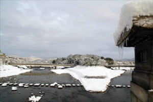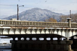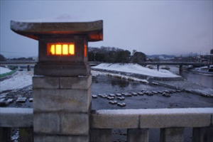 今出川通に架かる賀茂大橋(かもおお/かもおほ-はし)は、西からの鴨川と東からの高野川の合流点、三角州・糺の森のすぐ下流に位置している。 橋の上からは、北には北山、西に比叡山、大文字山、東山の峰などを一望することができる。 橋の東にある大文字山は、「山当て」といわれる景観手法が用いられている。これは視線の先に山がくるように、通りの方向を定めた古来からの都市計画の一つになる。 ◆歴史年表 南北朝時代、1353年、疫病が流行り、糺河原に8万4000基の石塔が立てられ病平癒を祈願する。 室町時代、1464年、鞍馬寺の塔建立のため、糺河原で勧進能が催され、将軍・足利義政・日野富子・大名らも参列した。(『糺河原勧進猿楽日記』) 江戸時代、1645年、干菜山光福寺の八幡宮再建のため、糺河原で勧進相撲が催された。(『古今相撲大全』) 1654年、『新版平安城東西南北町井洛外之図』には、大原口(賀茂大橋)の記載がある。 近代、木橋が架かり、「出町橋」、「今出川橋」とも呼ばれていたという。 1931年、近代の建築家・武田五一の意匠設計により現在の橋が架けられる。7月10日、渡初式が行われた。(「京都日出新聞」) 現代、1981年より、夜間に欄干の14基の石灯籠(ナトリウム灯)に灯りが入る。 ◆武田 五一 近代の建築家・建築学者・武田 五一(たけだ-ごいち、1872-1938)。男性。備後福山(広島県)の生まれ。父・備後福山藩士・司法官・平之助(直行)、母・八重の第5子。父の赴任に従い、神戸、姫路、岐阜、高知に住む。1888年、京都第三高等中学校補充科に入学した。1894年、京都第三高等中学校本科を卒業し、京都帝国大学工科大学造家学科に入学する。1897年、帝国大学(東京帝国大学)造家学科(建築学科)を首席卒業し、同大学院に進学した。1899年、大学院中退後、東京帝大助教授に任じられる。東京高等師範学校講師嘱託、東京美術学校教官になった。1901年-1903年、文部省より命じられ欧州留学する。ロンドン・カムデン美術学校で学び、各地を巡る。アール・ヌーボー、セセッションなどを体験する。1903年、帰国後、京都高等工芸学校(現・京都工芸繊維大学)図案科教授になる。1904年、京都府技師を兼任し、平等院鳳凰堂・鹿苑寺金閣の保存に関わる。1907年、東京・福島行信邸で、日本初のウィーン・セセッションの様式を試みた。アール・ヌーボーの造形を紹介する。1908年、大蔵省臨時建築部技師を兼任し、国会議事堂建築のために欧米視察した。1912年、パナマ太平洋万国博覧会事務取扱嘱託になる。1915年、工学博士学位を取得する。勲四等瑞宝章を受賞した。1916年、法隆寺壁画保存会委員になる。1917年、片岡安らと「関西建築協会」を設立する。1918年、名古屋高等工業学校(現・名古屋工業大学)校長に転任した。1920年-1932年、京都帝国大学建築学科創立に伴い教授になる。1925年、大蔵省営繕管財局技師を兼任した。1929年-1931年、京都帝国大学営繕課長事務取扱として学内建築物の造営に関わる。1931年、欧米出張し、19カ国を訪れた。1934年以来、法隆寺大修理工事事務所長を務める。65歳。 「関西建築界の父」といわれた。奈良・京都の古社寺保存修復、橋梁、博覧会場、公園、記念碑、都市計画、街路施設、家具意匠、染色なども手掛けた。主な作品として、旧日本勧業銀行本店(1899) 、日本初のセセッション建築とされる東京・福島邸(1907)、京都府立図書館(1909)、京都・円山公園(1912)、京都・同志社女子大学ジェームス館 (1913) 、京都・旧松風嘉定邸 (現・五龍閣、1914)、山口県庁舎・県会議事堂(1916) 、大阪・瀧安寺鳳凰閣(1917) 、兵庫・清水寺根本中堂・大講堂・本坊・客殿(1917) 、東京・旧村井吉兵衛邸(現・延暦寺大書院、1919) 、 兵庫・清水寺鐘楼 (1919)、兵庫・光明寺根本本堂(1925) 、 和歌山・高野山大学図書館 (1928)、代表作の東方文化学院京都研究所(1930)、京都・同志社女子大学栄光館(1932) 、鳥取・三朝大橋(1934年) など多数。葵橋、賀茂大橋なども設計した。 ◆賀茂大橋 現在の賀茂大橋の架設年は近代、1933年になる。意匠設計は、近代の建築家・武田五一による。石製高欄、歩道燈籠など和風意匠が取り入れられている。 橋種は8径間ゲルバー鋼プレートガーターであり、流水部の中央の4径間はゲルバー式鋼板桁、両端の2径間は、単純桁が組み合わされている。石灯篭の高欄などの一部は石造になっている。石燈籠の欄干は全部で14基あり、1981年からナトリウム灯が点灯されている。 橋長は鴨川に架かる橋の中で最長の141.4m。橋の幅は22m/23.2mある。路線名は銀閣寺宇多野線。 ◆鴨川 鴨川(かもがわ)は加茂川、賀茂川とも表記されている。三角州で加茂川、高野川が合流し鴨川になる。公的には鴨川で統一されている。 ◆三角州 鴨川と高野川の合流点である出町三角州は、「糺河原」、「出町剣先」、「鴨川デルタ」などとも呼ばれる。 この付近は、洛中と洛外の境に位置し、京の七口の要所の一つになっていた。二川の水運の要衝地であり、下鴨神社(賀茂御祖神社)への参道にも当たってい