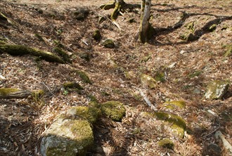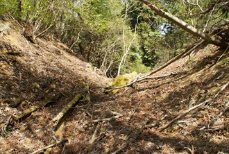 ![]() 案内の道標「京北十景 周山城址」とあった。山頂までの案内は詳しい。 ![]() 北山杉林の中の山道 ![]() 本丸の東、出丸的な小規模の石垣、土留めになっている。 ![]() 二の丸、削平部分 ![]() 石段 ![]() 東の城の虎口、本丸登城口は尾根を利用しており上り坂になっている。突きあたりが本丸になる。 ![]() 登城口にあった瓦片。 ![]() 本丸 ![]() 天守台の石垣 ![]() 本丸の窪地、周囲には石垣が積まれている。 ![]() 現地にある説明板、東西が逆になっているため、地図を反転している。上が北になる。 赤い線の部分が石垣で、緑の線の部分が盛り土・土塁。通常の登山口から上ると右手から入る。東端(右端)に「二ノ丸」、中央部分が東の城の「本丸(主郭)」、南に「鷹屋ノ丸」「馬屋ノ丸」、西に「小姓丸」と呼ばれる郭がある。本丸と西の郭の付け根部分に、虎口が見えている。 ![]() 井戸跡、開口部は1.5mほど。 ![]() 本丸南西尾根の郭 ![]() 本丸西の郭 ![]() 西方端の郭石垣、野面積み(3m)が良好に残っている。 ![]() 本丸西の石垣、石材はチャート、自然石の野面積による。 ![]() 城山より樹間の北の眺望、日本海の小浜に続く周山街道(国道162号線)が見えている。 ![]() 本丸西にある堀切の一つ、尾根部分をかなり深く掘り込んでいる。 ![]() 【参照】栗尾峠からの京北の町、桂川 |